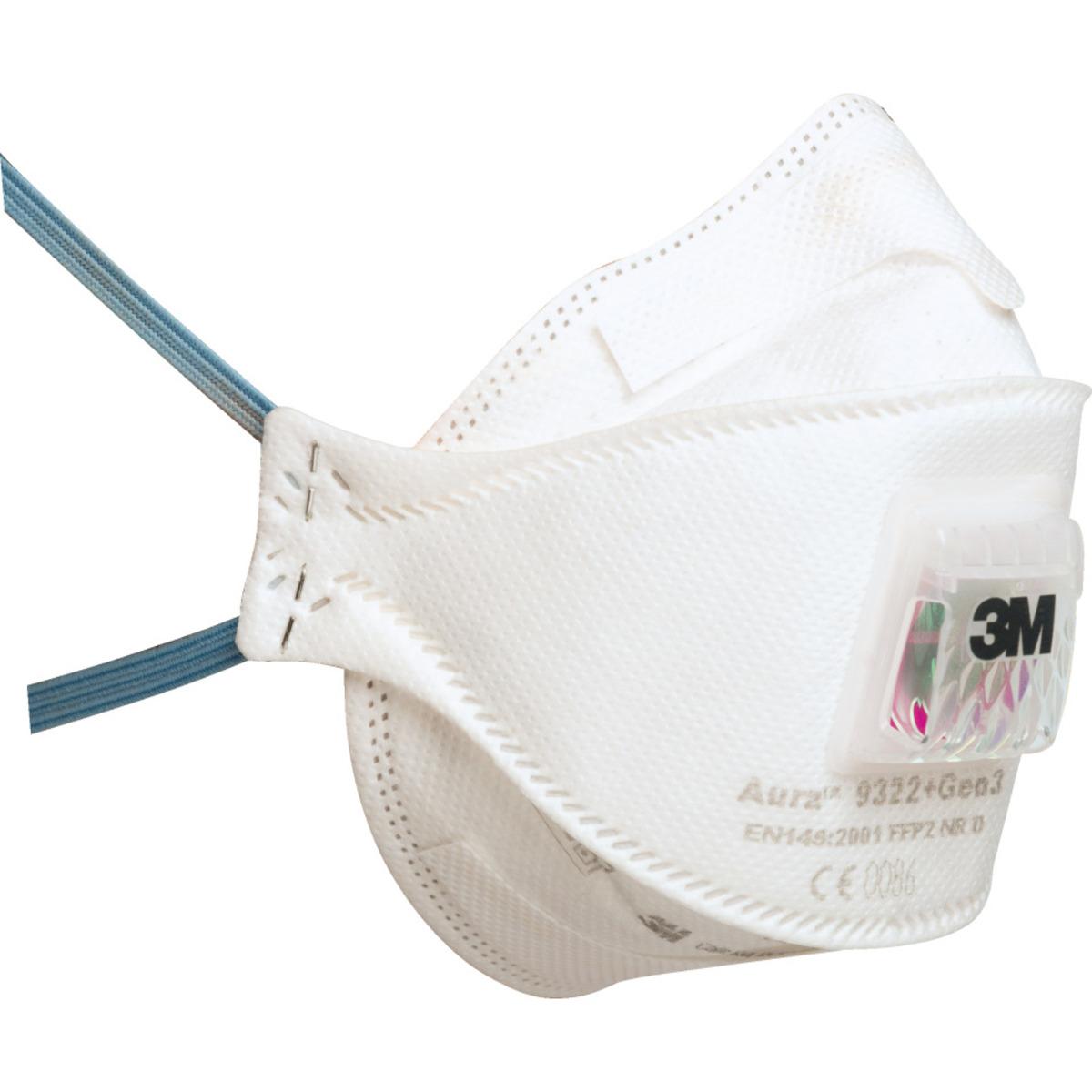Partikelfiltrierende Einweg Feinstaubmaske 3M Aura Serie 9300+ für zuverlässigen Schutz vor luftgetragenen Gefahren, 3-teiliges flach faltbares Design mit innovativen Laschen für optimalen Sitz, mit Cool Flow Ausatemventil für weniger Hitze und Feuchtigkeit