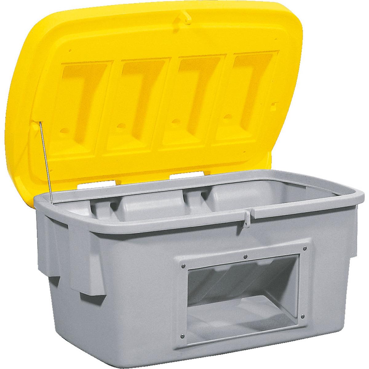 asecos® Streugutbehälter, mit Entnahmevorrichtung, schlagfest und witterungsbeständig. Die Deckel können leicht und ohne Werkzeug demontiert werden. Ineinander stapelbar mit integrierter Abschließvorrichtung für ein Vorhängeschloss