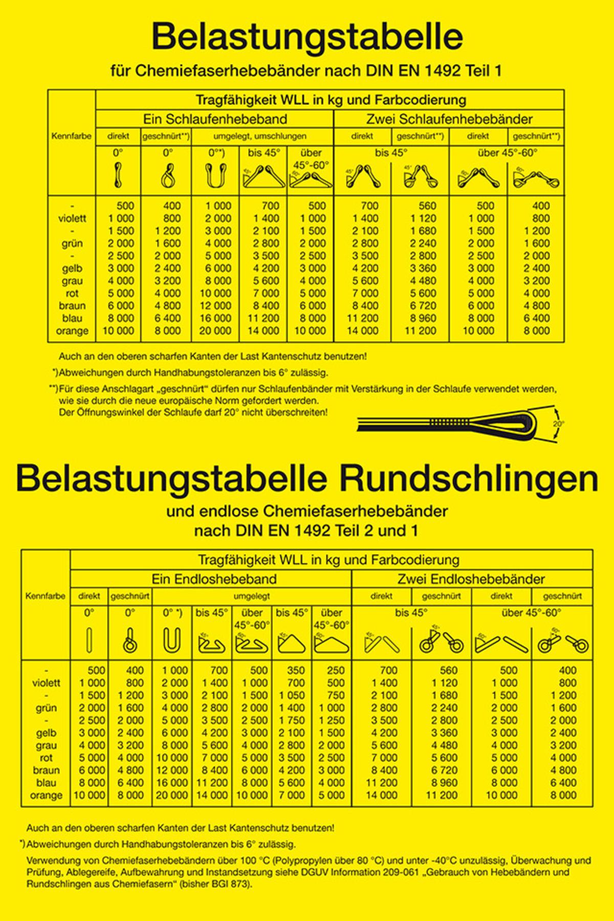 Vorschriftsgemäßer Aushang mit Informationen über Belastungstabellen, welche die Tragfähigkeit von verschiedenen Anschlagmitteln angeben.
