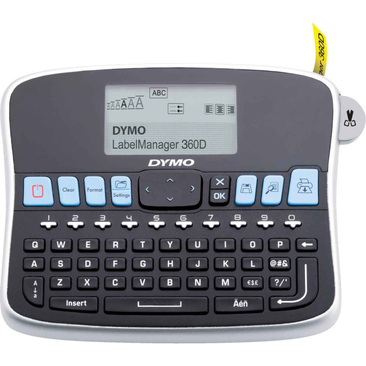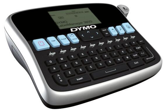 Etikettendrucker DYMO LabelManager™ 360D zum Erstellen von Etiketten in 7 Schriftgrößen, 3 Schriftstilen, 7 Textstilen, 8 Rahmen und Unterstreichung, schnelle Texteingabe durch die QWERTZ-Tastatur, Speicherung von 9 häufig verwendeten Etiketten für einen schnellen Zugriff, mit wiederaufladbarem Lithium-Ionen-Akku und Ladeadapter