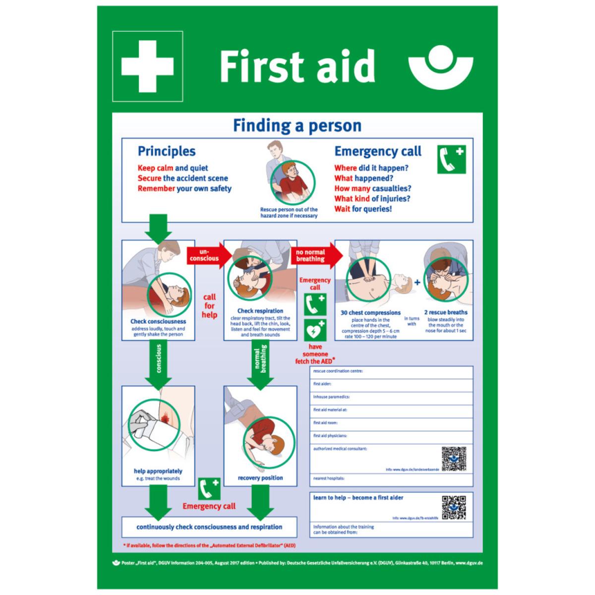 Erste Hilfe Aushang auf englisch mit allen wichtigen Erste-Hilfe-Maßnahmen nach Auffinden einer Person