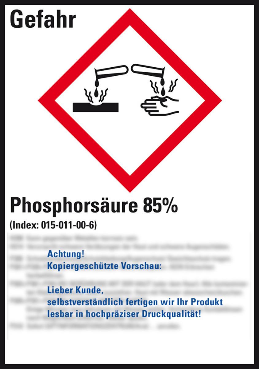 Auswahl: GHS-Etikett Phosphorsäure 85%, gem.GefStoffV/GHS/CLP, Folie, 52x74mm, 10/Bogen