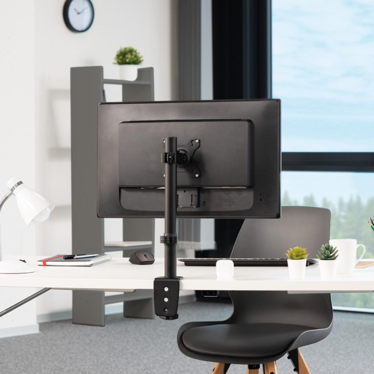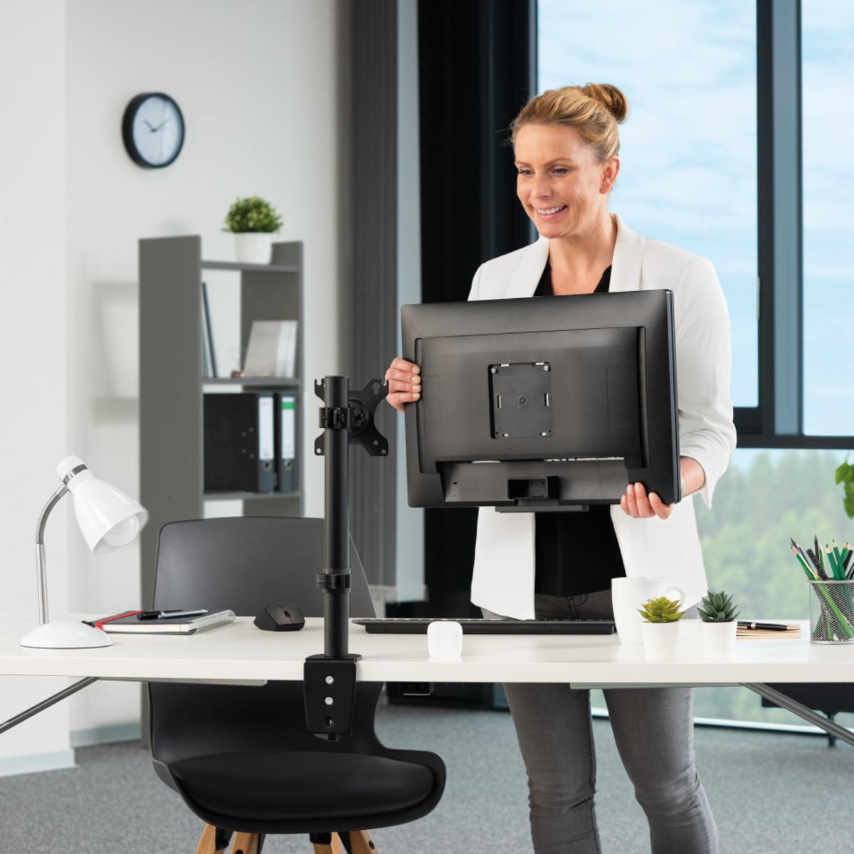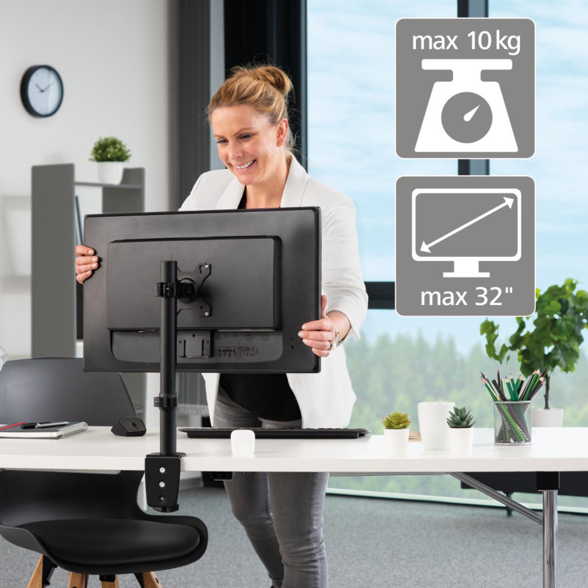 hama Monitorhalterung für eine ergonomische Sitzhaltung mit weniger Rückenschmerzen, kann mit einer Diagonale von 33–81cm (13"-32") und bis zu einem Gewicht von 10 kg verwendet werden. Mit der Klemmschraube ruckzuck am Schreibtisch angebracht, höhenverstellbar, schwenk-/neigbar.