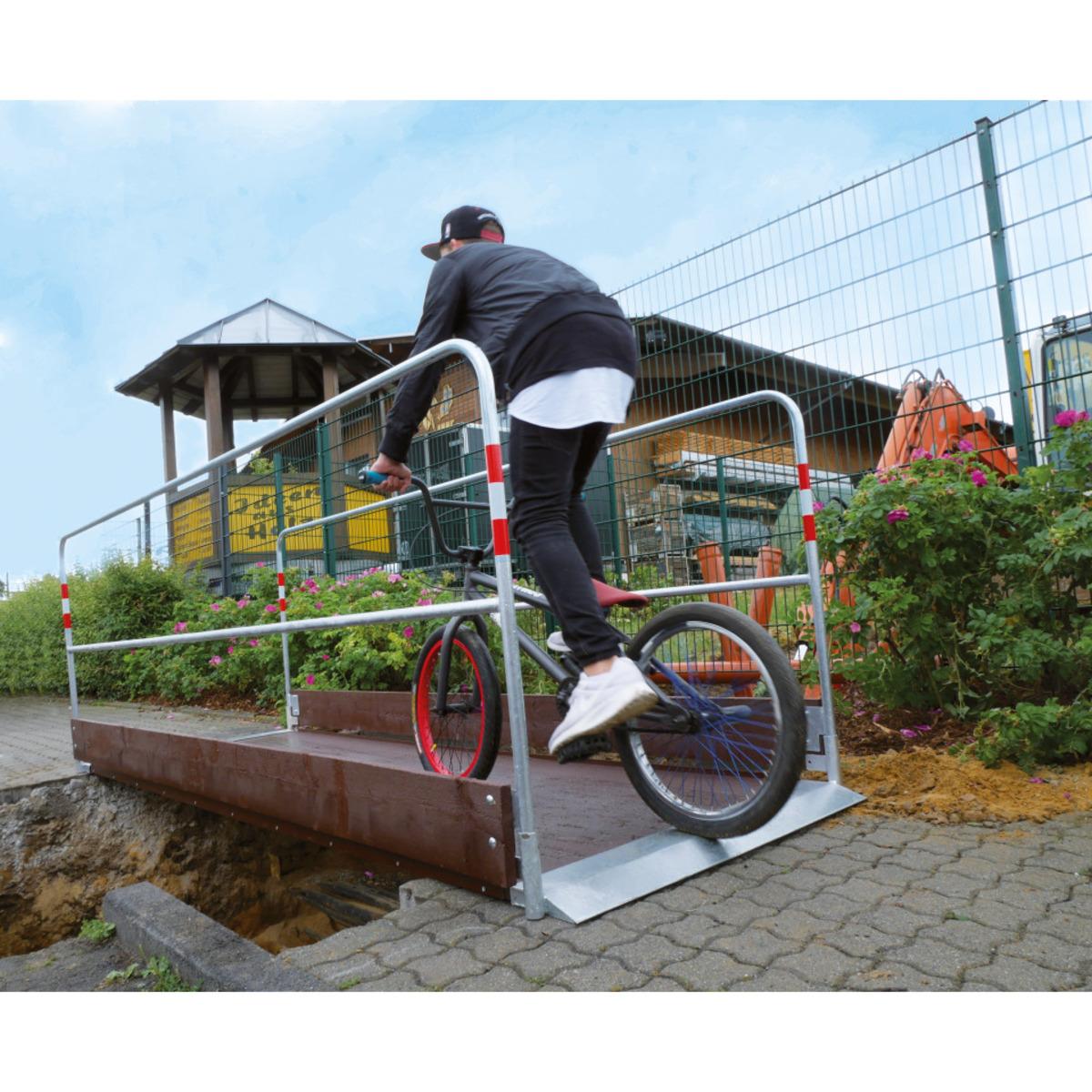 Grabenbrücke für den sicheren Übergang über Gräben und Kanäle, Gestell herausnehmbar, mit Auffahrrampe, Holzbelag und Bordbrett aus mehrfach beschichteter, rutsch- und wetterfester Reinholzplatte.