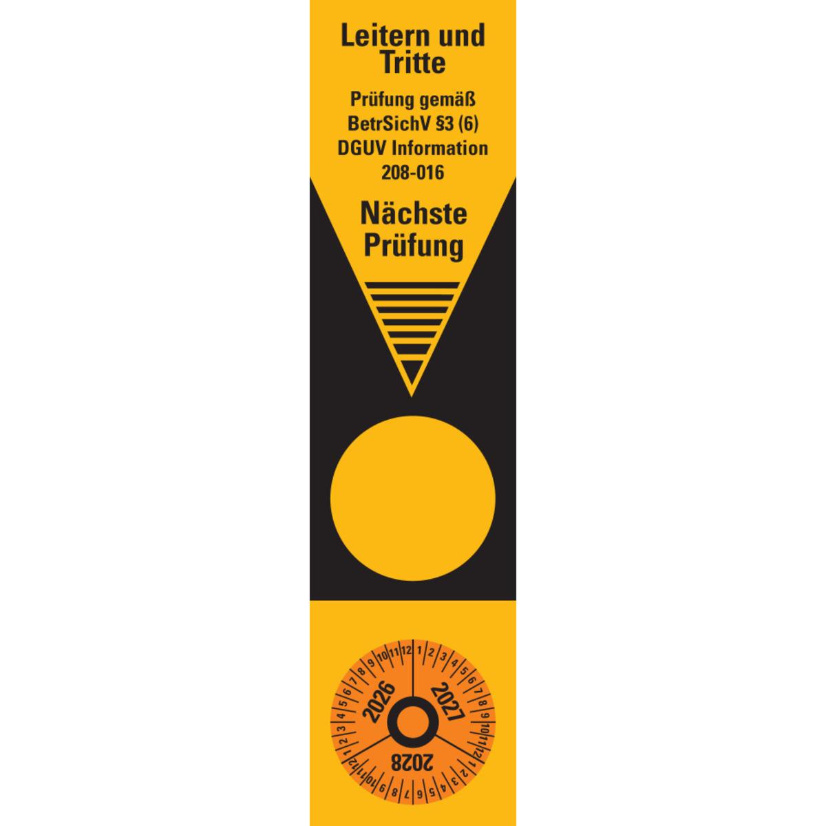 Grundetiketten "Prüfung gemäß BetrSichV § 3 (6), DGUV Information 208-016" erleichtert die vorgeschriebene Prüfung von Leitern und Tritten auf deren ordnungsgemäßen Zustand