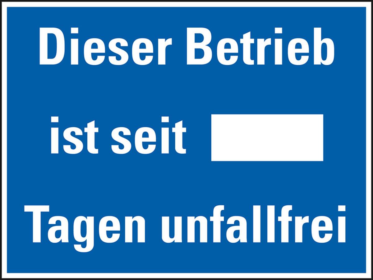 Das Hinweisschild "Dieser Betrieb ist seit ___ Tagen unfallfrei" vermittelt dem Betrachter Informationen für mehr Sicherheit und als Anreiz für die Einhaltung der Sicherheitsbestimmungen.