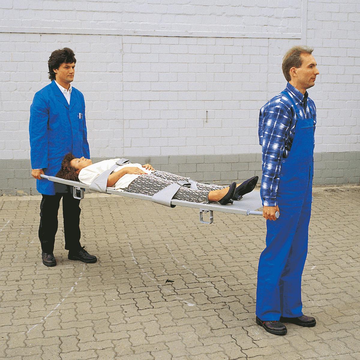 Zusammenklappbare Krankentrage zum sicheren Transport von Verletzten.