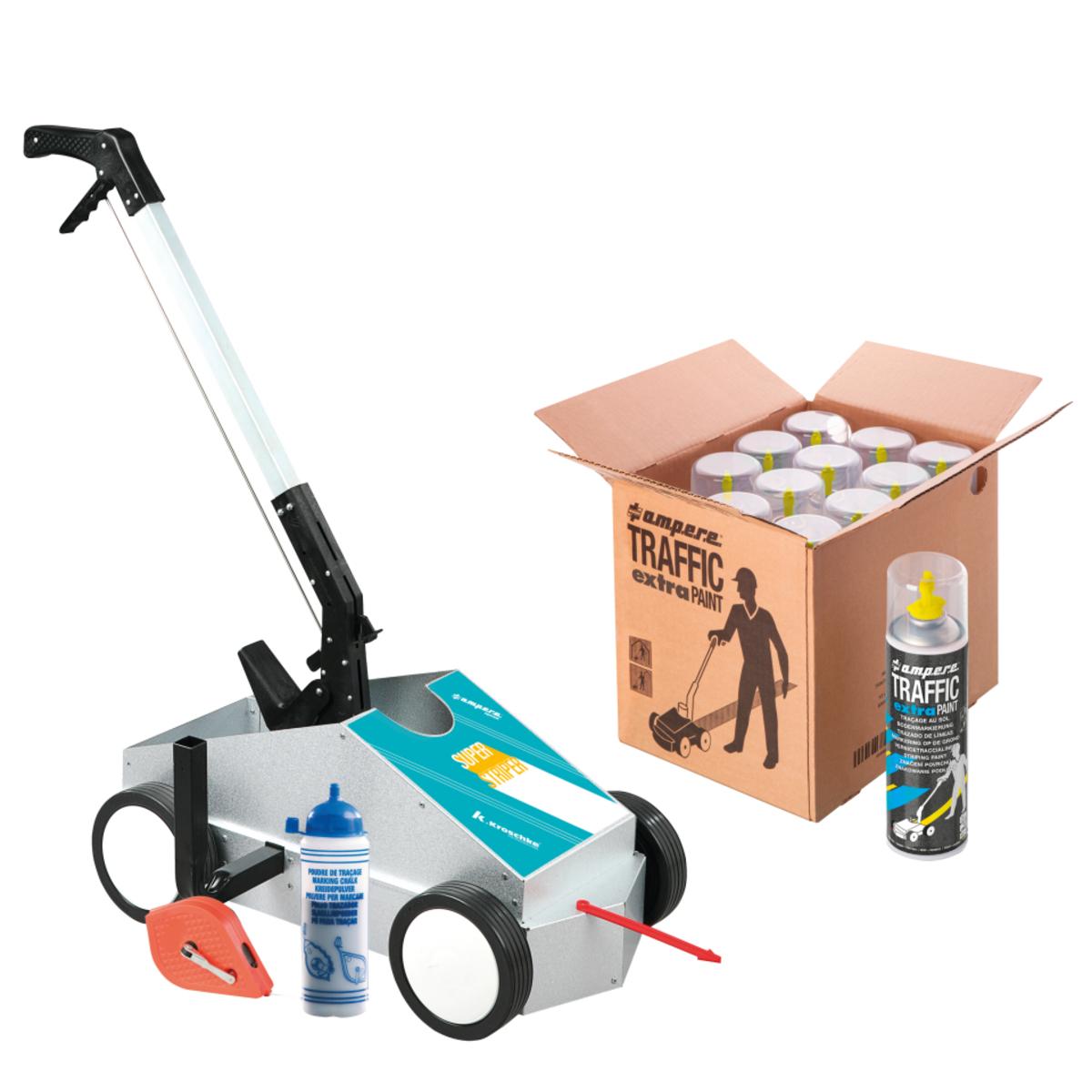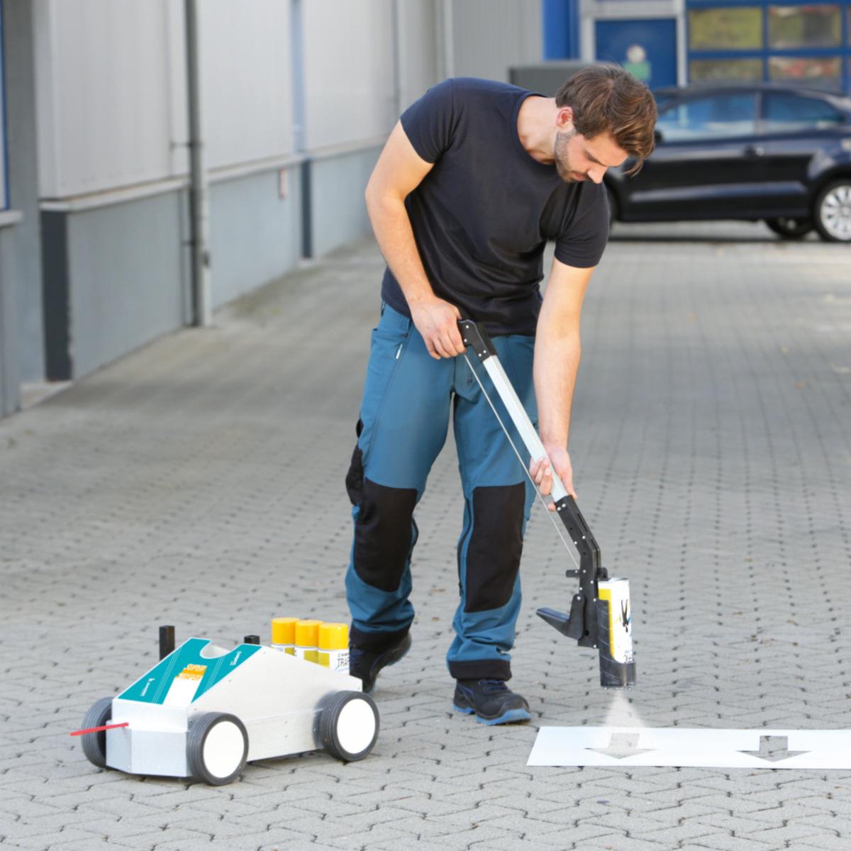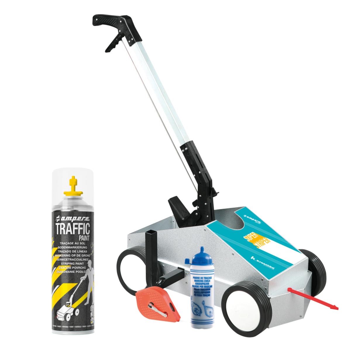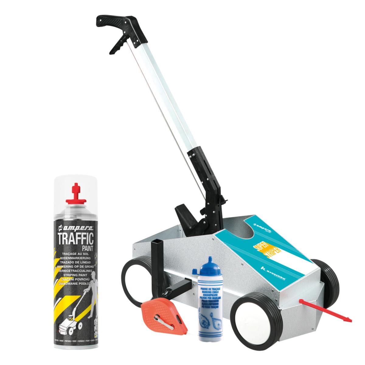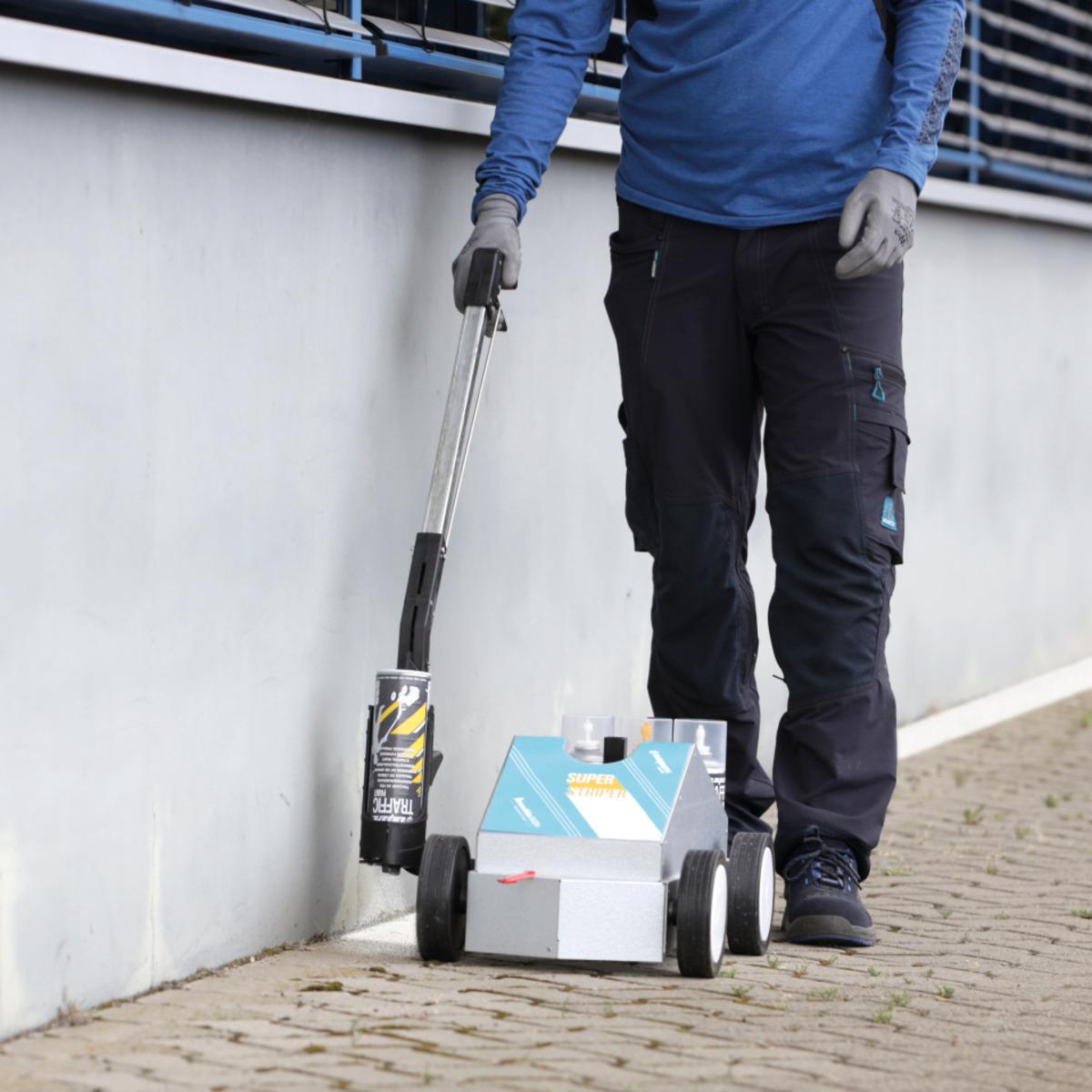 Vorteils-Set Bodenmarkierungsfarbe Traffic mit Markierwagen SUPER Striper® zum schnellen Markieren von Flächen oder Linien für Einstellplätze, Wegmarkierungen etc., mit Bodenmarkierungsfarbe Traffic für dauerhafte, randscharfe Bodenmarkierungen innen und außen.