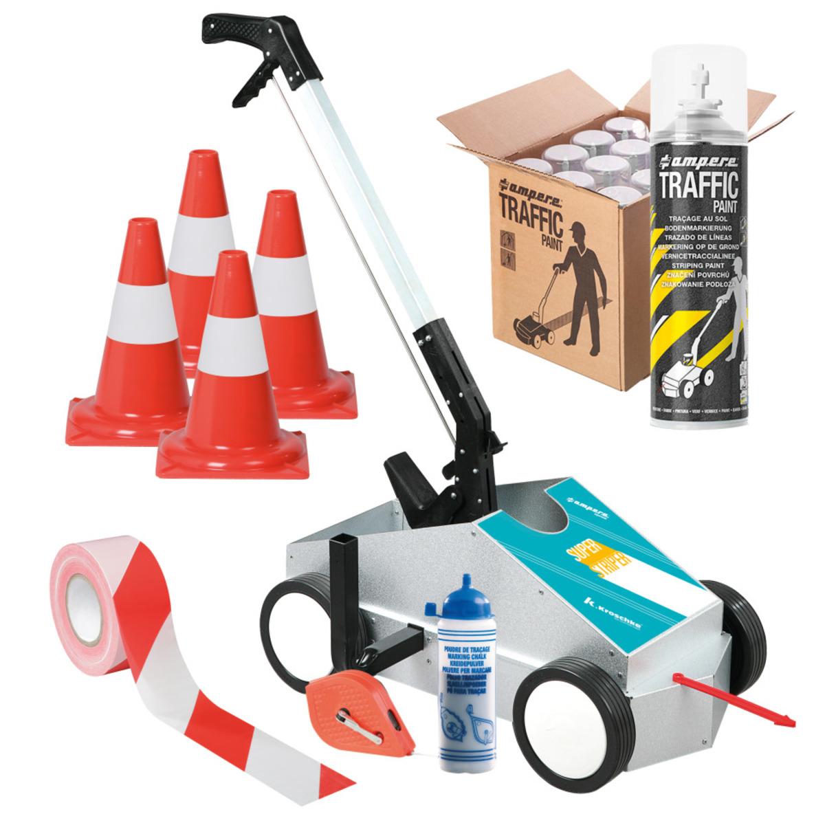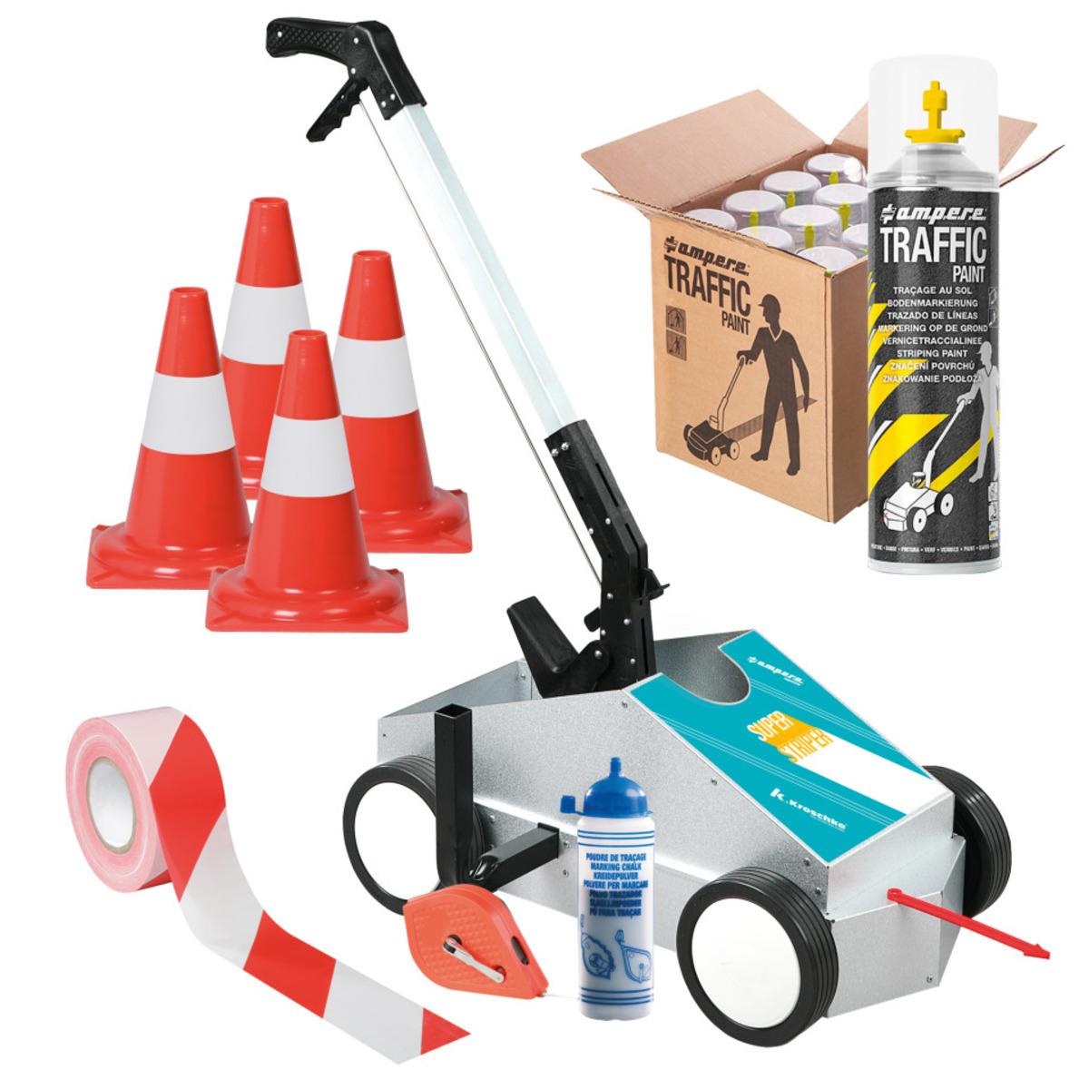 A.M.P.E.R.E. SUPER-Striper® Profi-Set für die Kennzeichnung von Wegen und Plätzen, bestehend aus Der SUPER-Striper, Traffic Paint-Markierfarbe, Leitkegel und Absperrband. Der SUPER-Striper kann schnell zum Handgerät umgebaut werden, ist nutzbar als Side-Striper und besitzt eine Halterung für 3 Ersatzdosen.