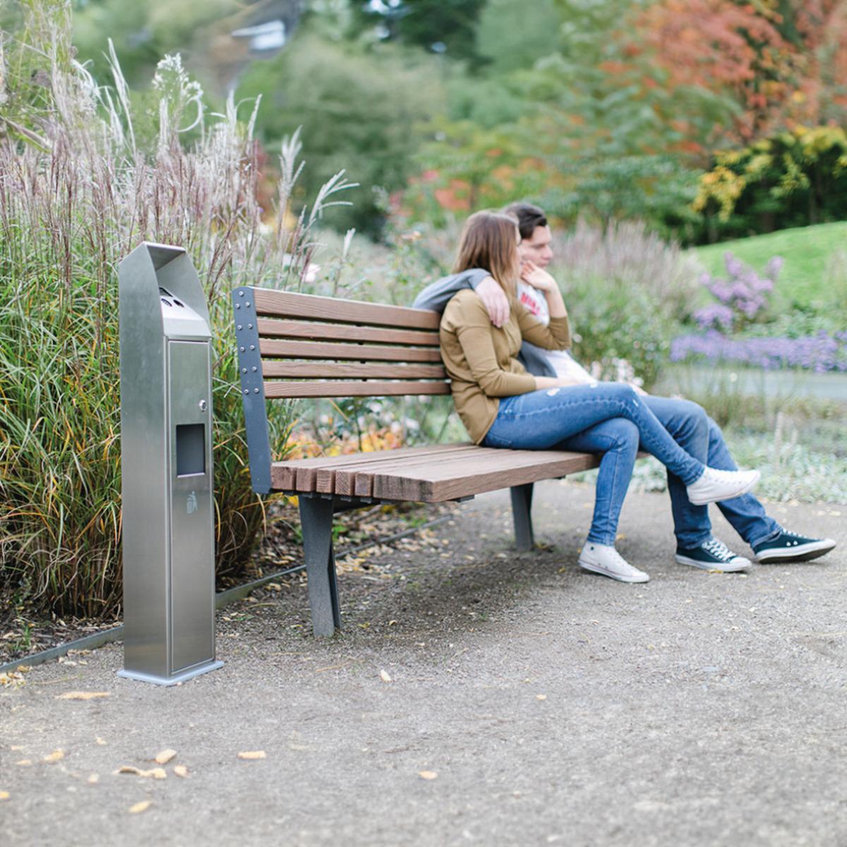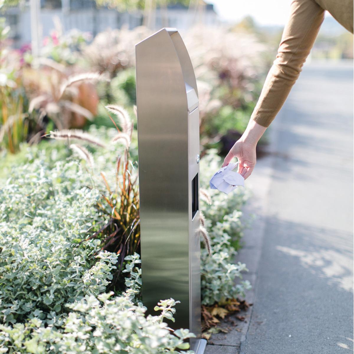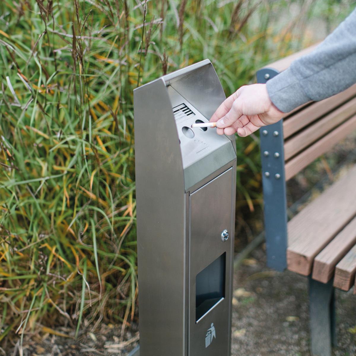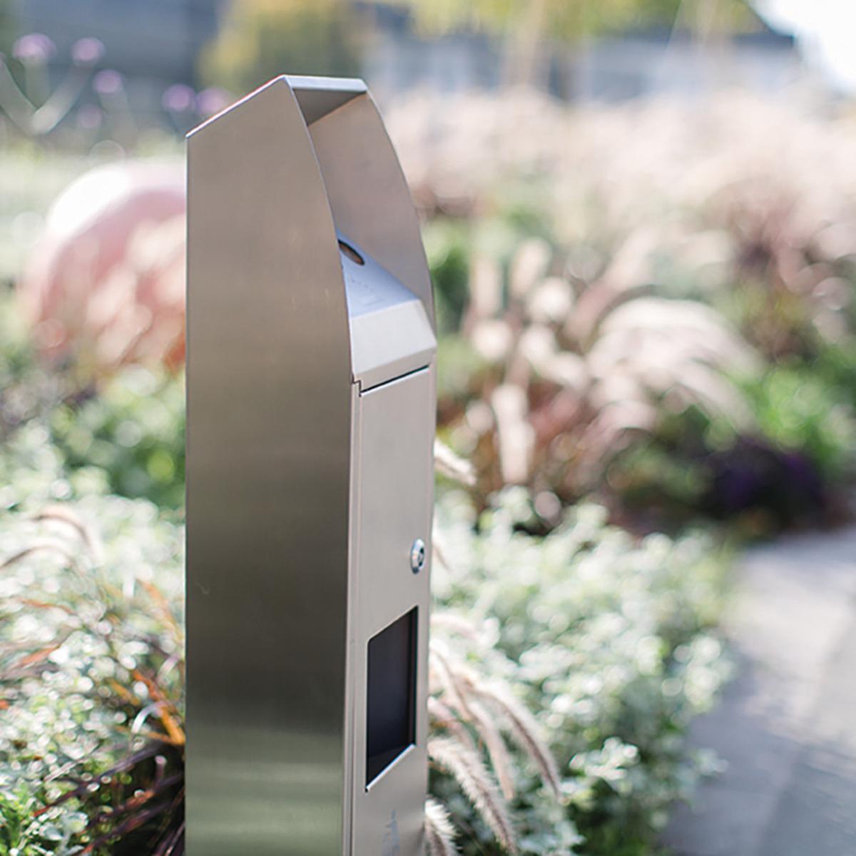 Der Abfall Ascher Kombination Block verfügt über zwei separate, einzeln entnehmbare Inneneinsätze aus verzinktem Metall, welche mittels eines Dreikantschlosses abgeschlossen werden können. Die Befestigung am Boden erfolgt mittels einer Bodenplatte. Die an der Vorderseite angebrachte Tür kann seitlich geöffnet werden.