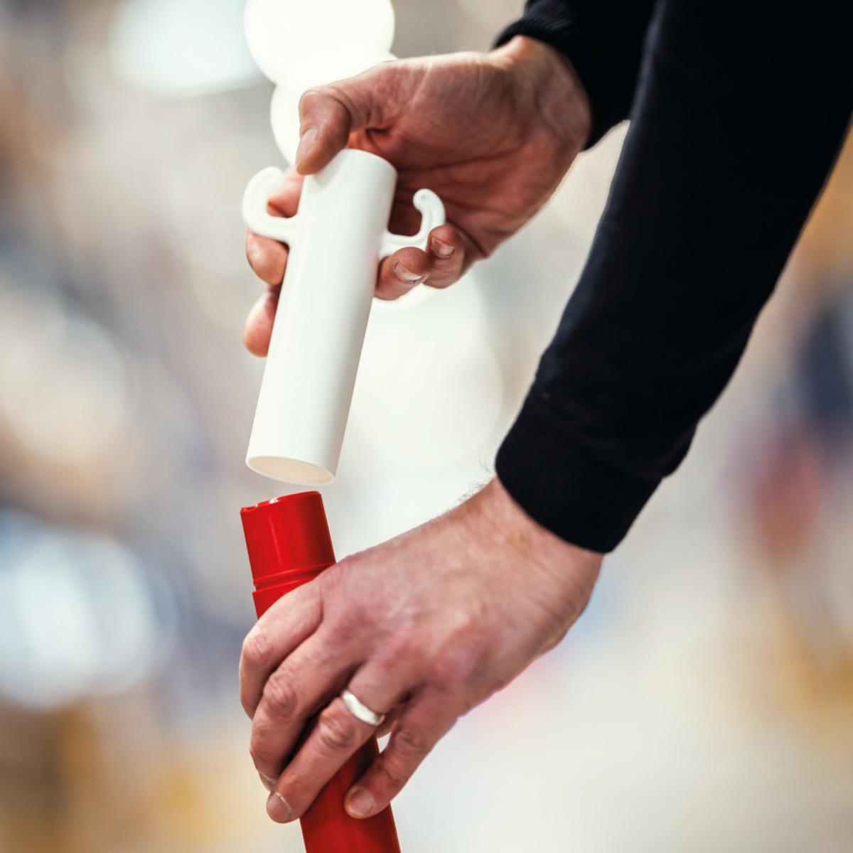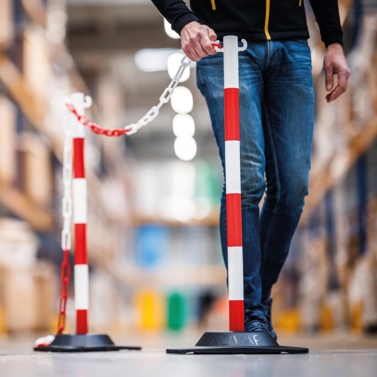 Die Absperrpfosten Clever mit 2 Kettenösen sind ohne Werkzeug leicht und schnell auf- und wieder abbaubar, platzsparend lagerbar und leicht im mitgelieferten Karton transportierbar.