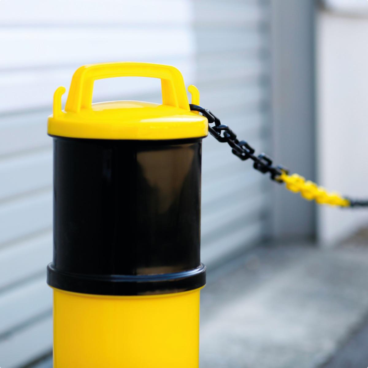 Der modulare Absperrpfosten kann befüllt oder fest installiert werden. Er besteht aus Sockel, vier Segmenten, Abdeckung, 5 m Kette sowie Montageschraube und Stab für einfachen Auf- und Abbau – flexibel für diverse Absperranwendungen.