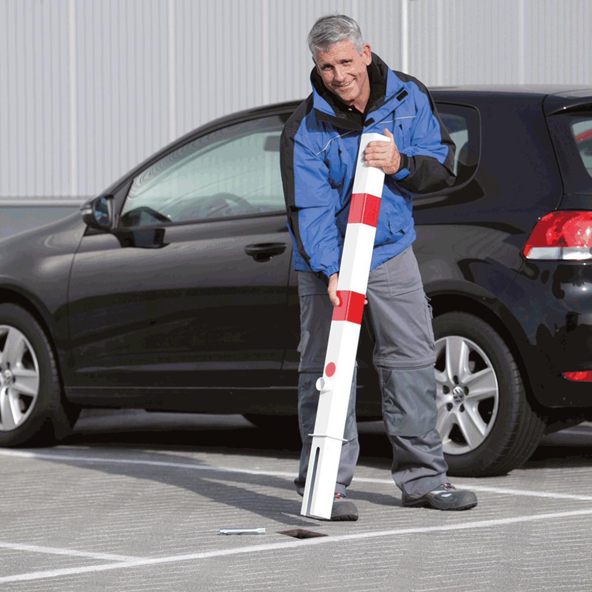 Absperrpfosten Wien zur Sicherung von Zufahrtswegen und Durchfahrten. Mit Bodenhülse, leichtgängigem Schließgestänge und Schloss gemäß DIN 3223 (Dreikantschlüssel bitte separat mitbestellen). Kompett zu entnehmen, dadurch keine Stolpergefahr, keine Überfahrschäden. 2 breite Reflexringe für mehr Sicherheit im Dunkeln