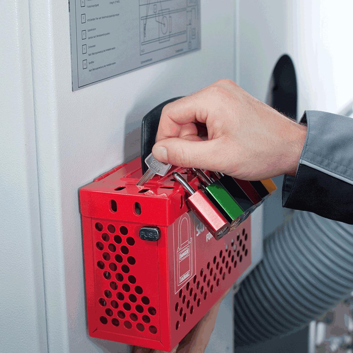 Das ABUS Wartungsschutzdepot Safety Redbox ist ein Wartungsverschlusskasten für mehrere Mitarbeiter zur Aufbewahrung von Verriegelungssystemen und Wartung von Anlagen mit vielen Ausschlusspunkten, stabil und leicht, für max. 18 Schlösser. Bei der Wartung von Anlagen werden alle Verriegelungspunkte gesichert, die Schlüssel in der Safety Redbox aufbewahrt und durch die Arbeiter mit ihrem Schloss verriegelt. Ist die Wartung abgeschlossen, werden alle Schlösser entfernt und die Verriegelungspunkte freigegeben.