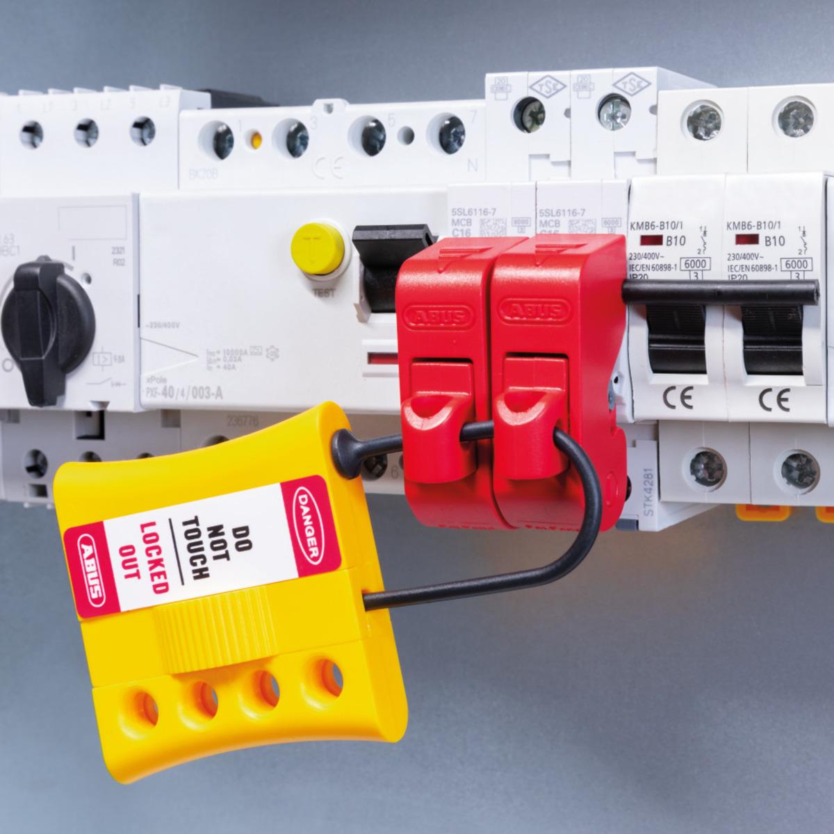 ABUS Hauptschalterverriegelung mit 4 Einhängepunkten, nicht leitend, 3 mm starker Bügel ermöglicht das Einhängen in kleinere Ösen