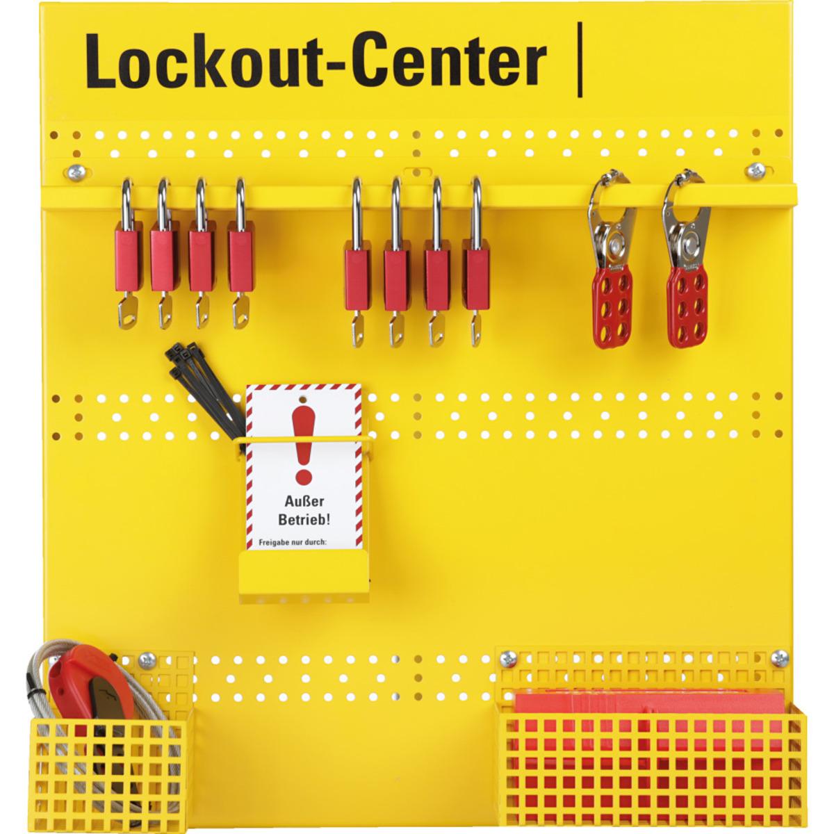 Zentrales Aufbewahrungssystem für zur Wartung benötigte Materialien. Der 100 mm Korb des Lockout-Centers schützt vor dem Verlust von Kleinteilen, während der 200 mm Korb z.B. zur Aufbewahrung kleinerer Ventilverriegelungen oder Steckerabsperrungen dient. Der Tag Holder ist angepasst auf das Maß unserer Wartungsaufkleber und -anhänger, die Schlosstraverse ist ideal zum Einhängen von Schlössern und Multischließklammern.