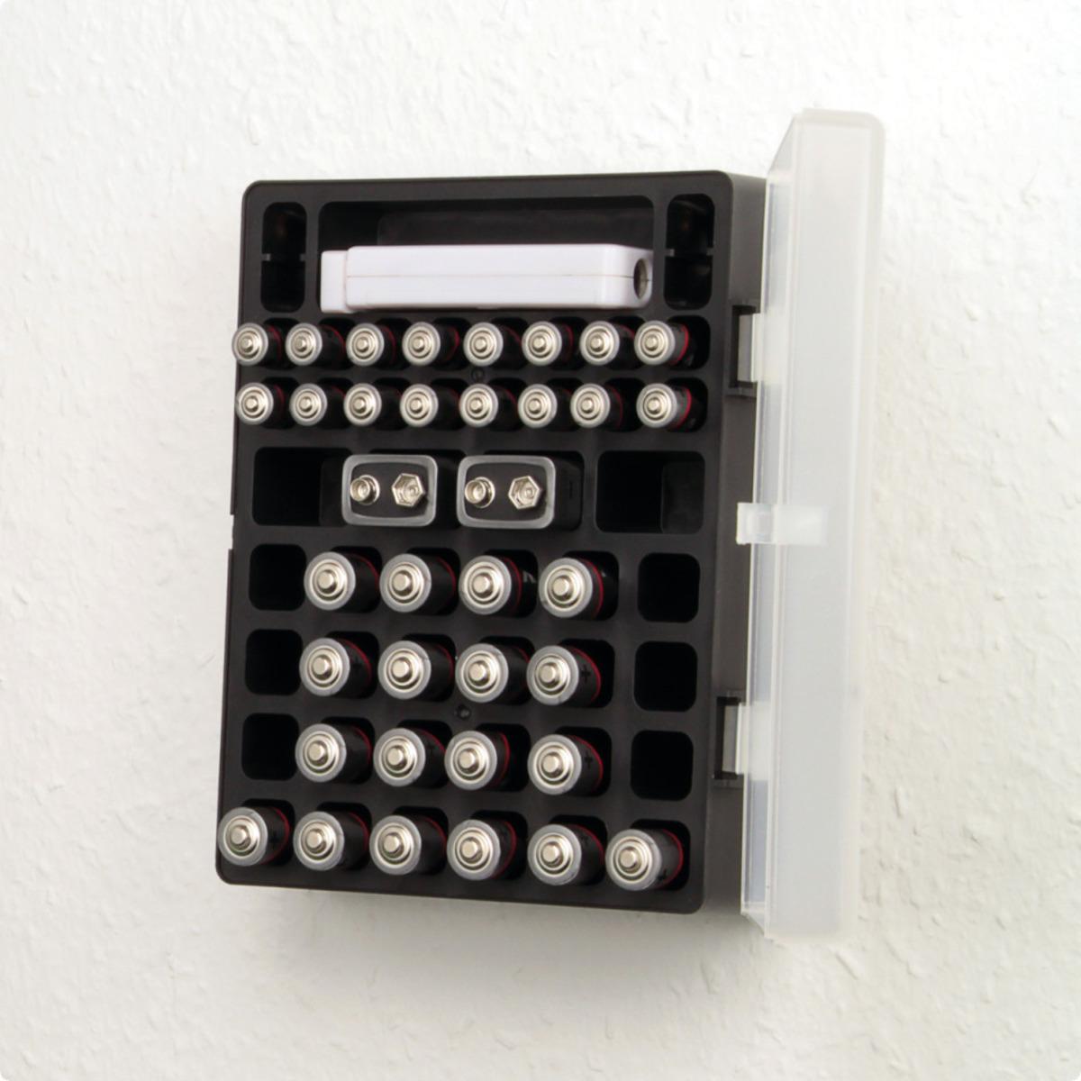 Die ANSMANN® Batteriebox 48 ist eine praktische Aufbewahrungsbox für bis zu 24 Mignon AA, 20 Micro AAA und 4 9V E-Block Akkus und Batterien, optimaler Schutz vor ungewollter Entladung, Staub und Schmutz, geeignet für die Wandmontage.