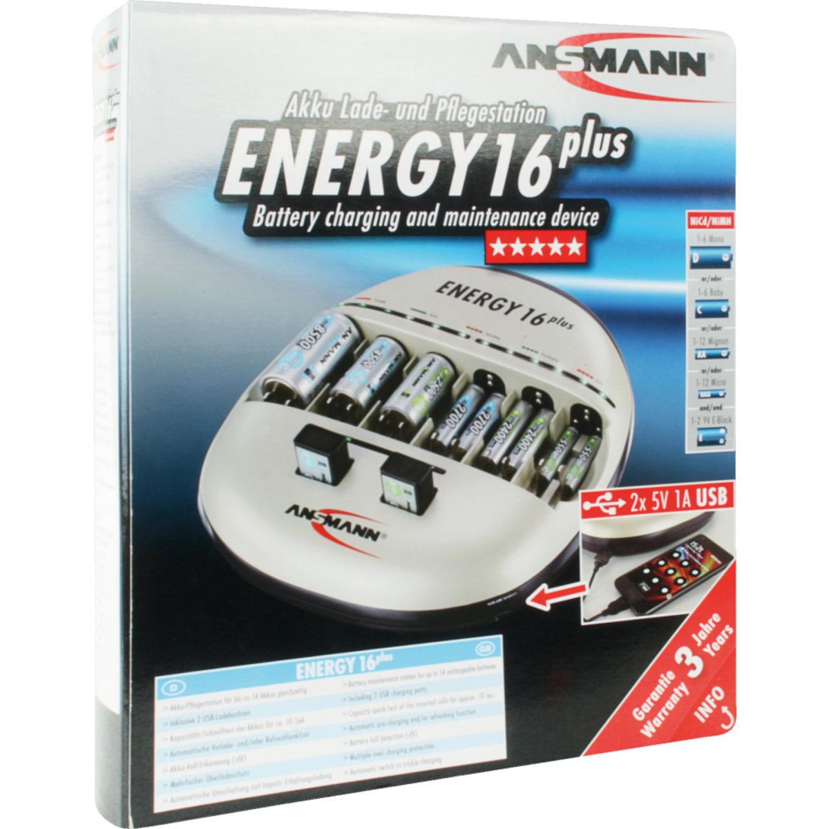 Das ANSMANN® Akkuladegerät ENERGY 16 plus ist ein mikrocontrollerüberwachtes Ladegerät mit Lademöglichkeit für 1-12 Micro AAA / Mignon AA, 1-6 Baby C / Mono D, 1-2 9V Block NiCd/NiMH-Akkus, ermittelt automatisch den optimalen Ladestrom für die eingelegten Akkus und lädt diese mit bis zu 1000mA im Schnellladeverfahren, zusätzliche USB-Buchsen bieten die Möglichkeit, auch mobile Geräte mit fest verbautem Akku und jegliche USB-ladefähige Geräte zu laden.
