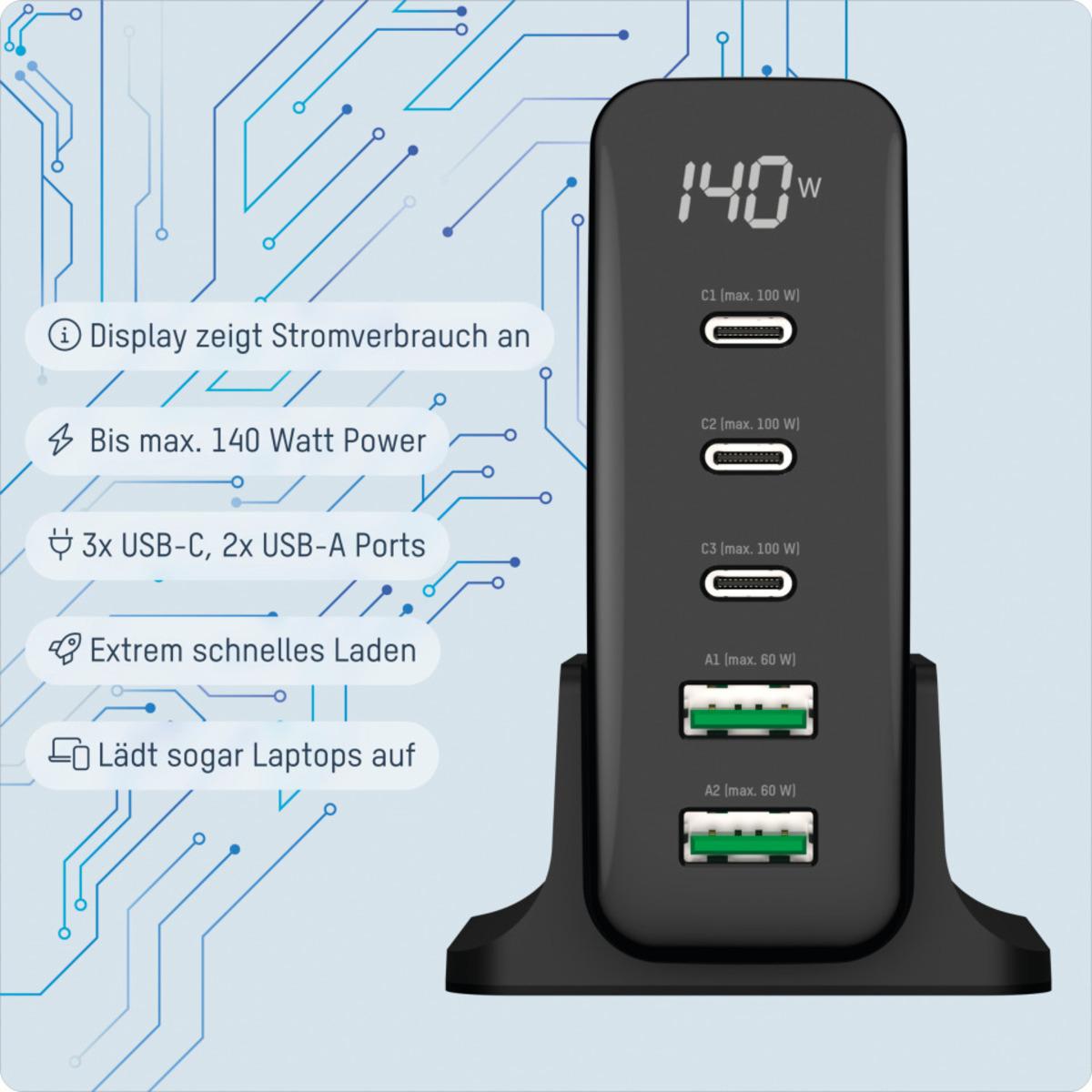 Multiladegerät kombiniert moderne GaN-Technologie mit hoher Alltagstauglichkeit. Mit einer Gesamtleistung von 140 W und fünf Ladeanschlüssen – drei USB-C- und zwei USB-A-Buchsen – lassen sich Smartphones, Tablets, Notebooks und weitere Geräte gleichzeitig und schnell mit Energie versorgen.