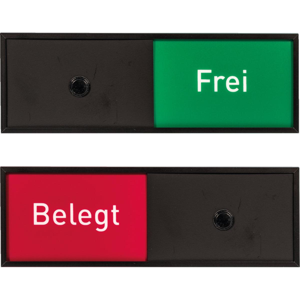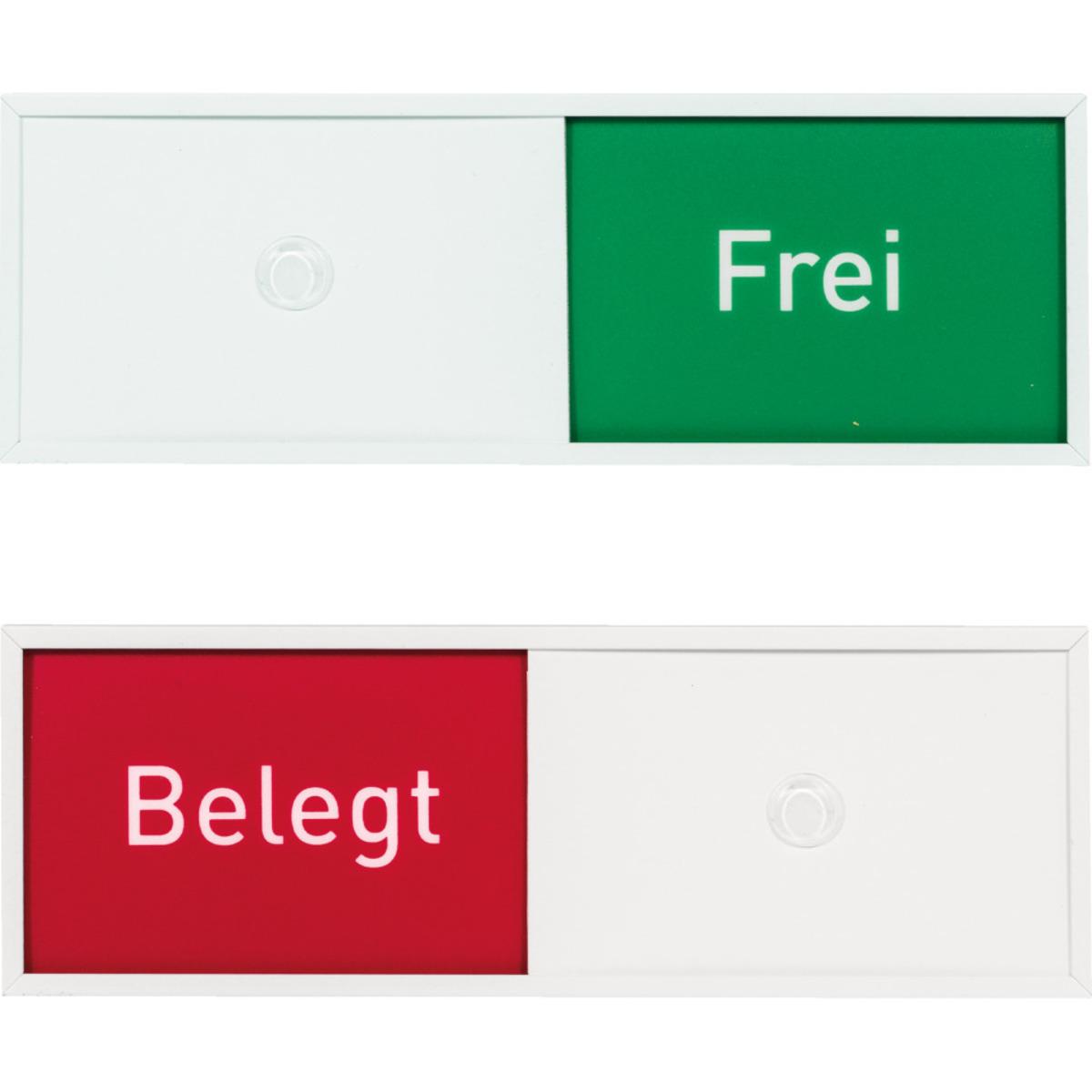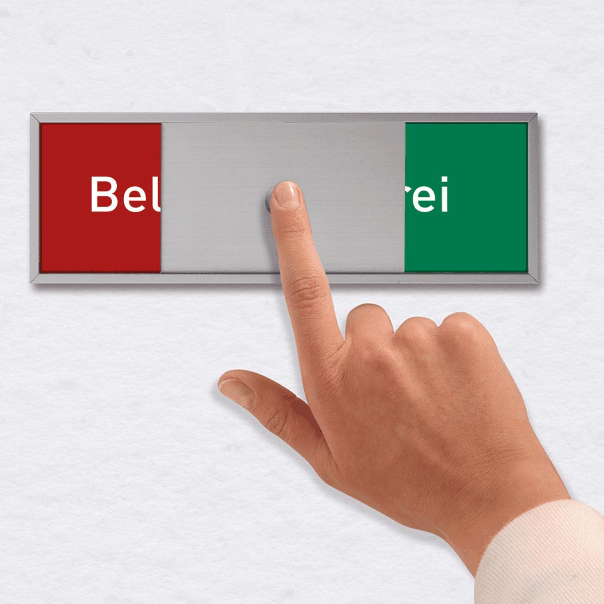 Mit der Anzeige "Frei - Belegt" zur Erweiterung eines Madrid-Türschilds kennzeichnen Sie beispielsweise Besprechungsräume. Mit Hilfe des verschiebbaren Reglers wird flexibel angezeigt, ob ein Raum bereits belegt ist oder zur Verfügung steht.
