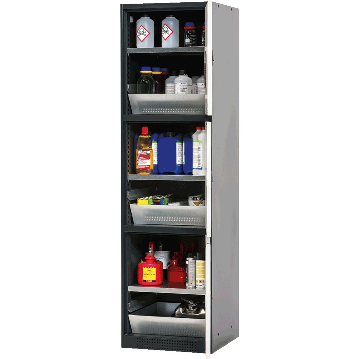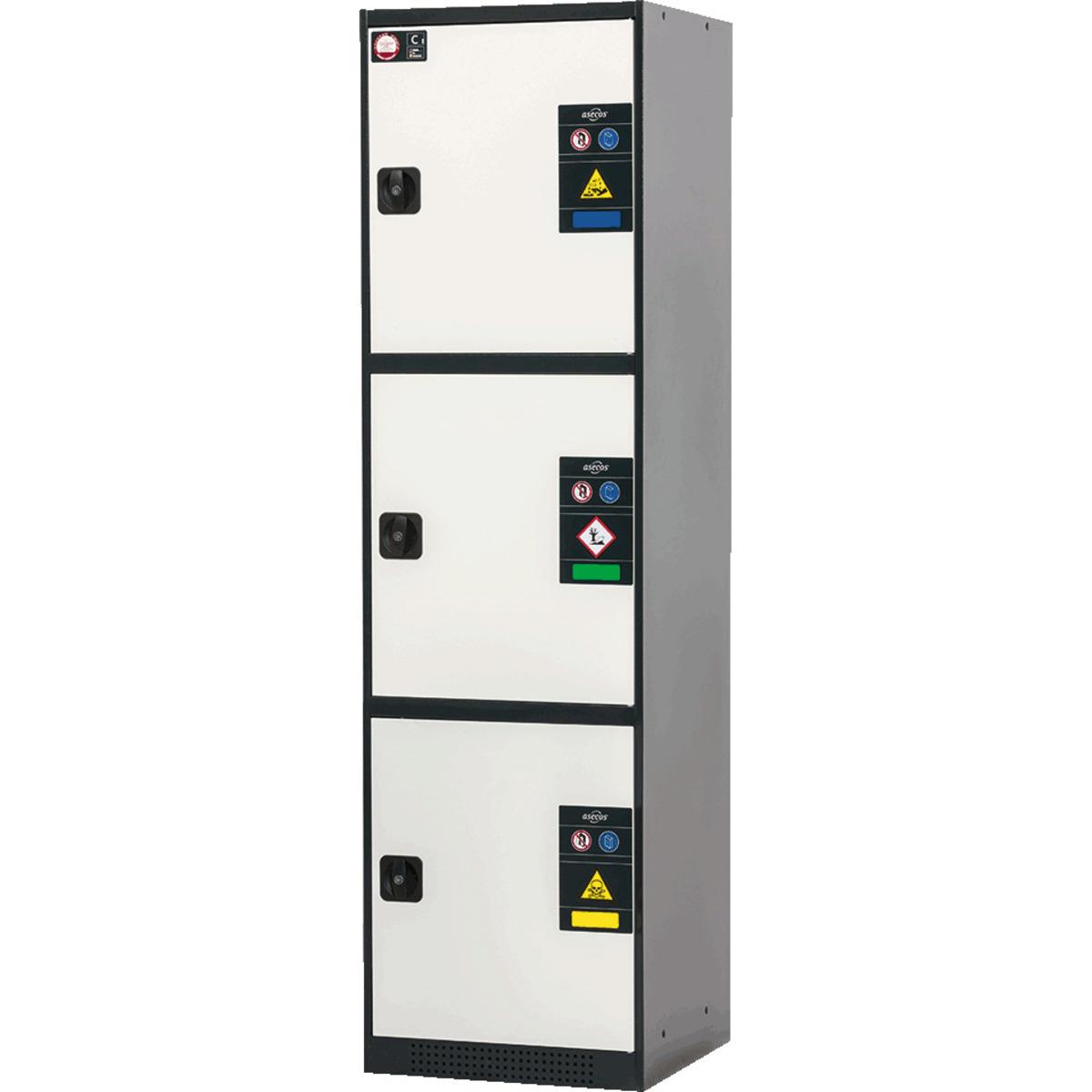 asecos® MultiRisk Chemikalienschrank CS-Classic mit 3 getrennten Lagerabteilen, jedes Abteil mit Flügeltür, Fachböden und Bodenauffangwanne, abschließbar mit integriertem Zylinderschloss, Belüftungsschlitze an der Vorderseite