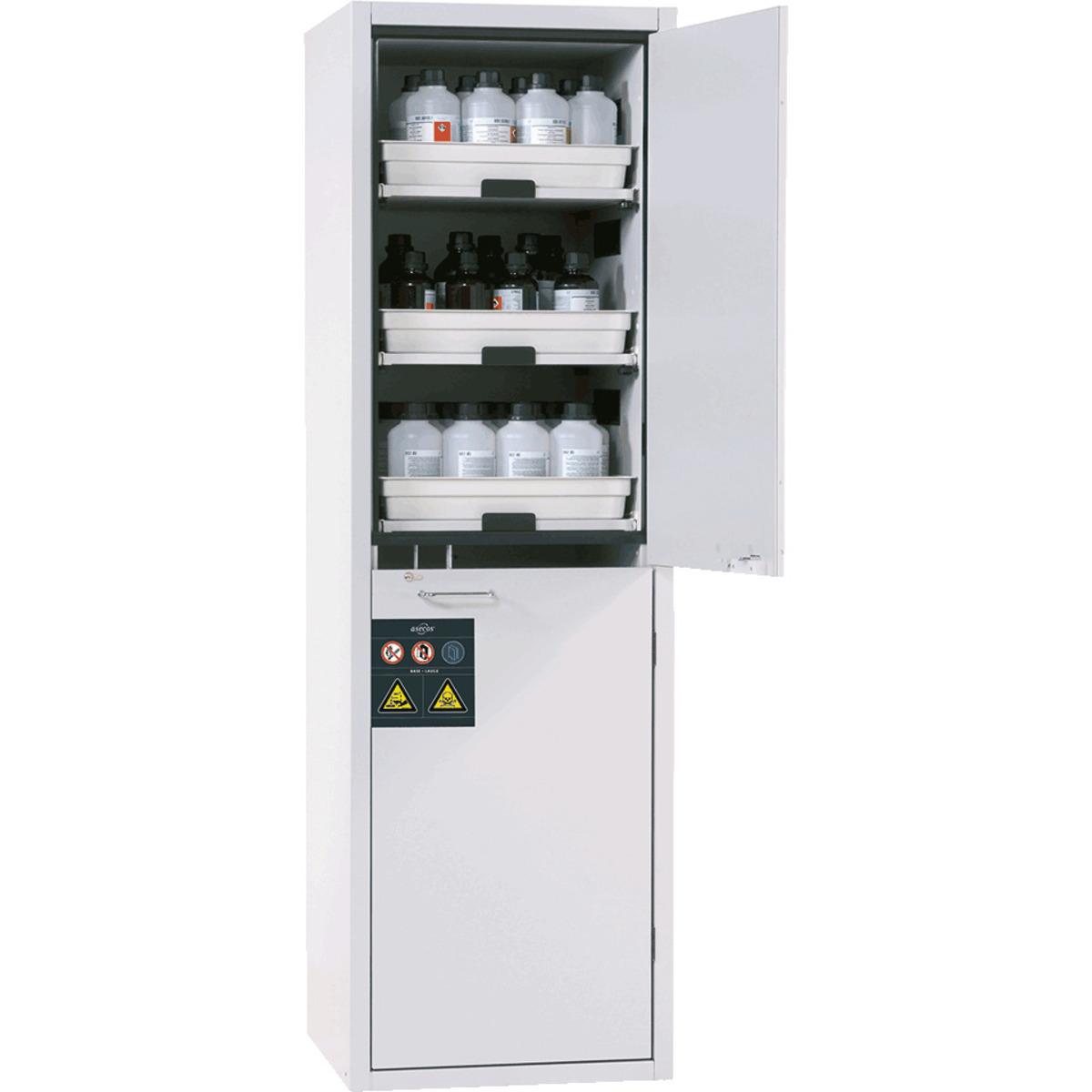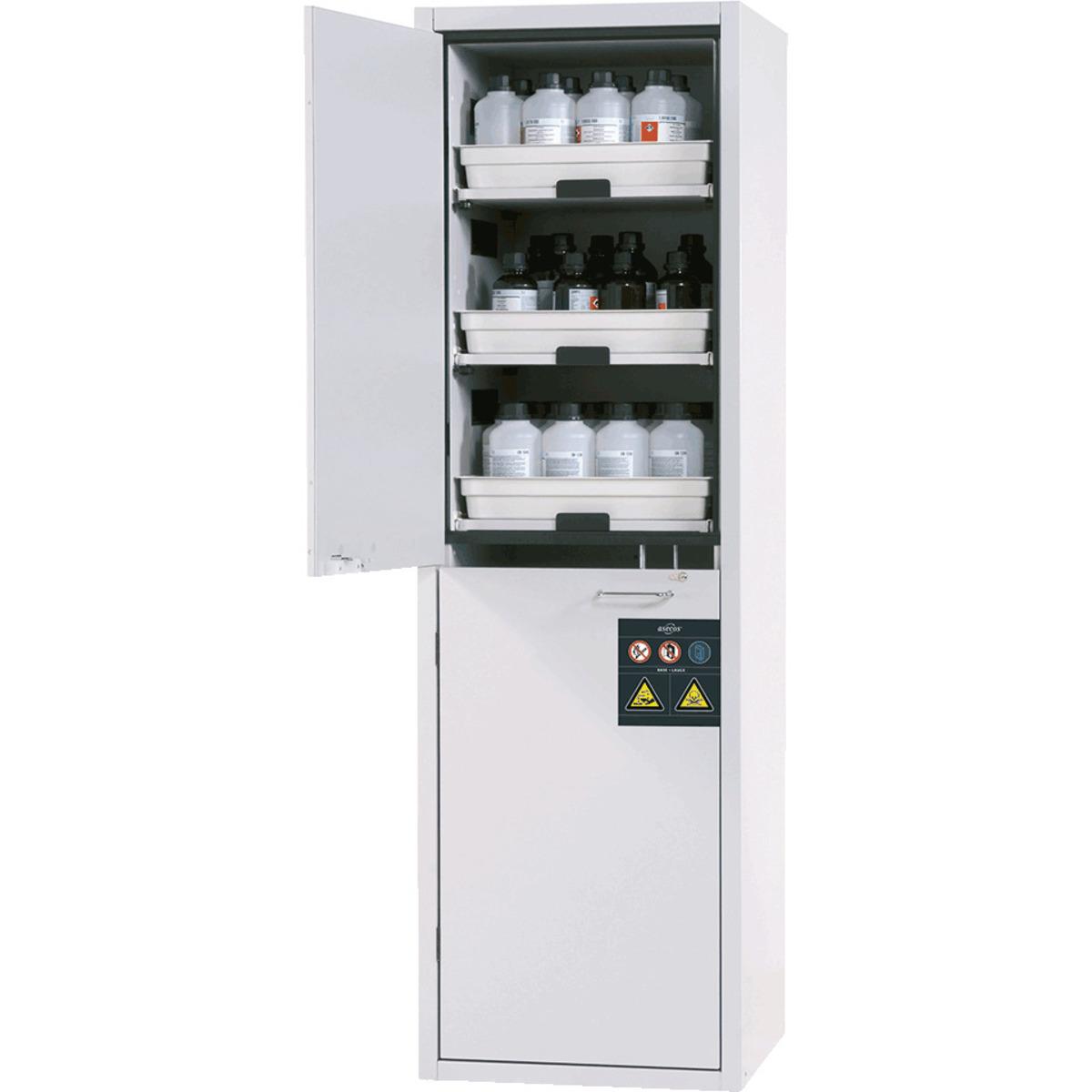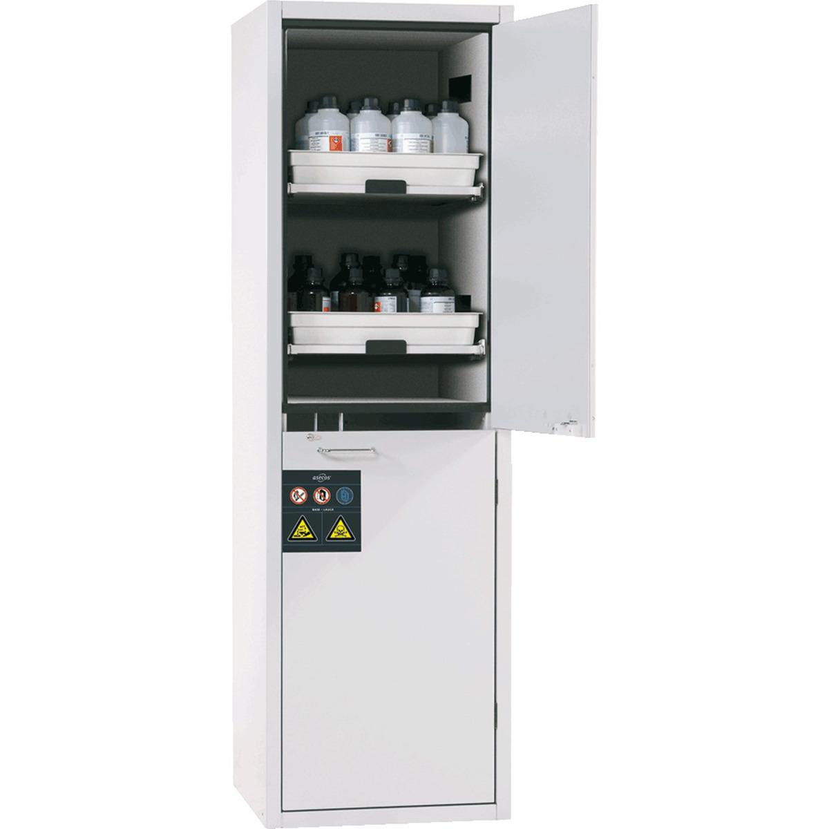 Robuster Säuren- und Laugenschrank asecos SL-Classic zur sicheren Verwahrung aggressiver Gefahrstoffe, getrennte Lagerung von Säuren und Laugen in nur einem Schrank, getrennte Tablarauszüge mit Auffangwanne, integriertes Profilzylinderschloss