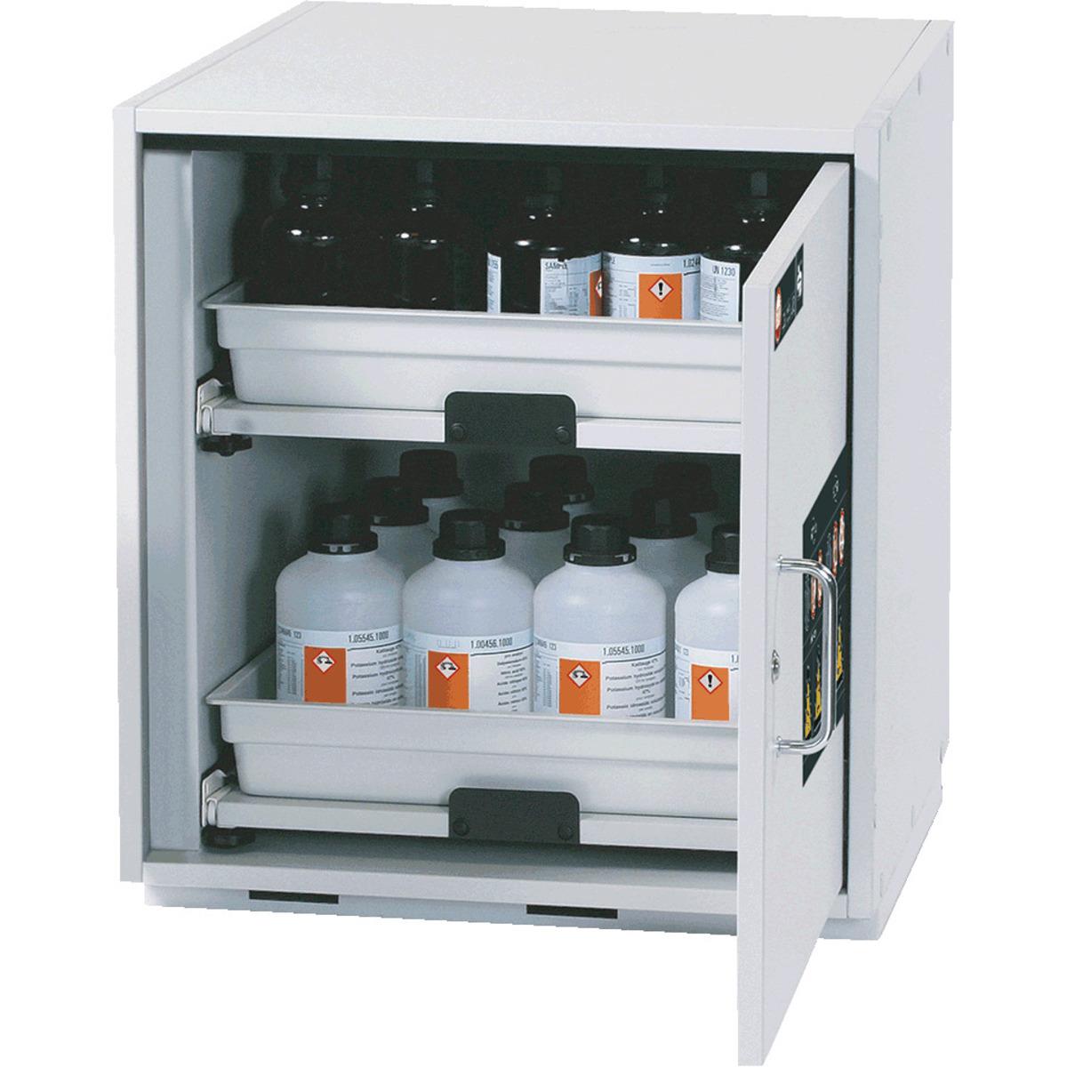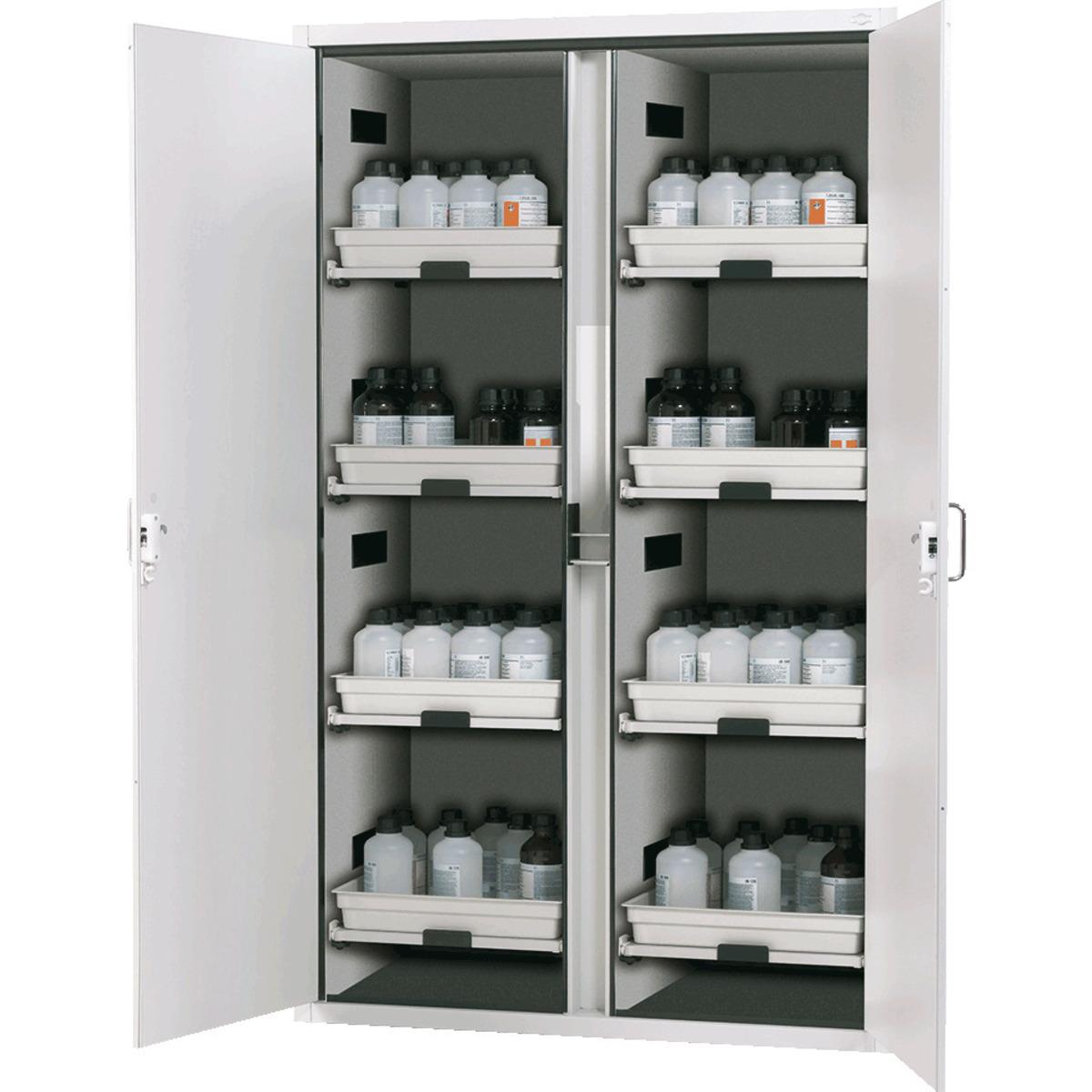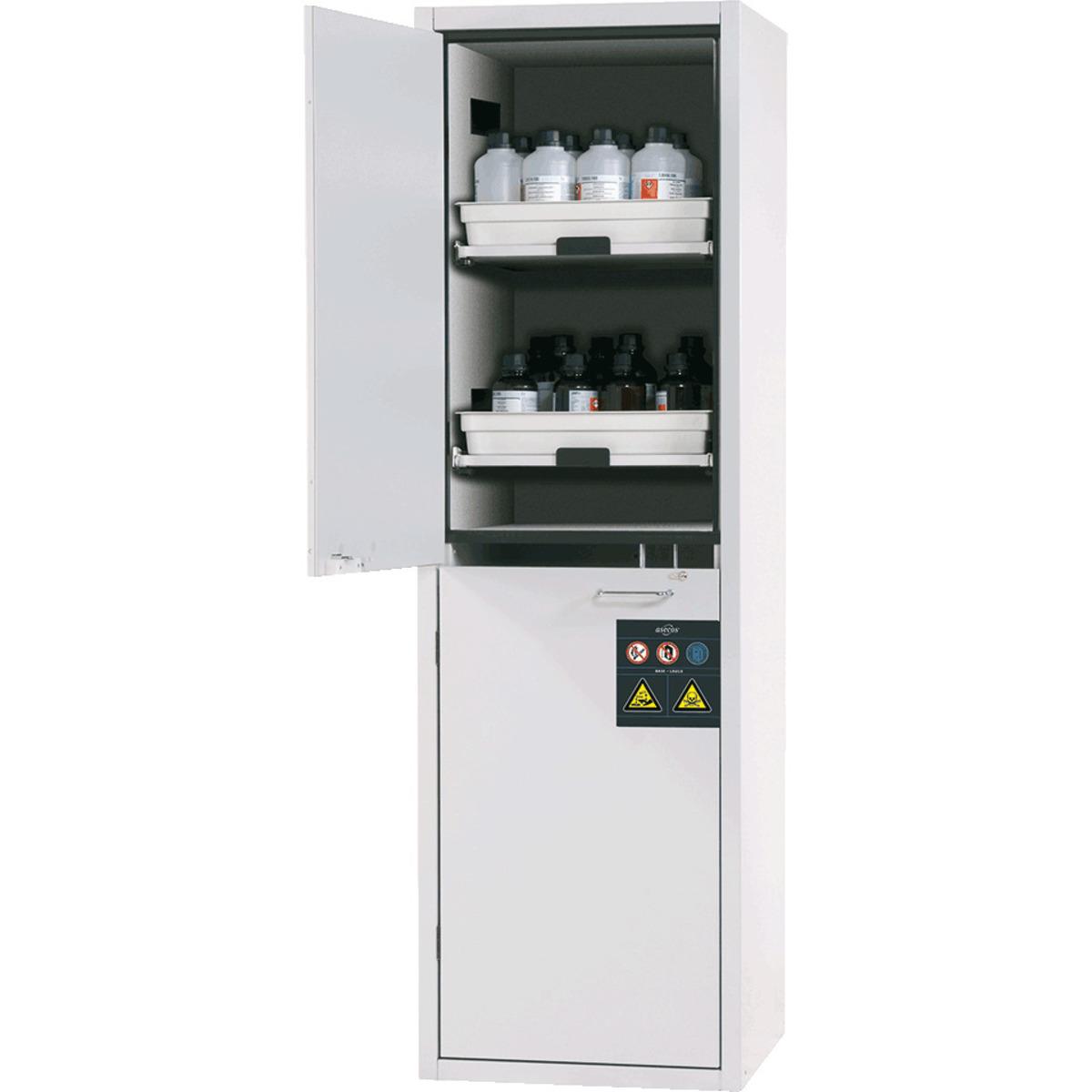 Robuster Säuren- und Laugenschrank asecos SL-Classic zur sicheren Verwahrung aggressiver Gefahrstoffe, getrennte Lagerung von Säuren und Laugen in nur einem Schrank, getrennte Tablarauszüge mit Auffangwanne, integriertes Profilzylinderschloss