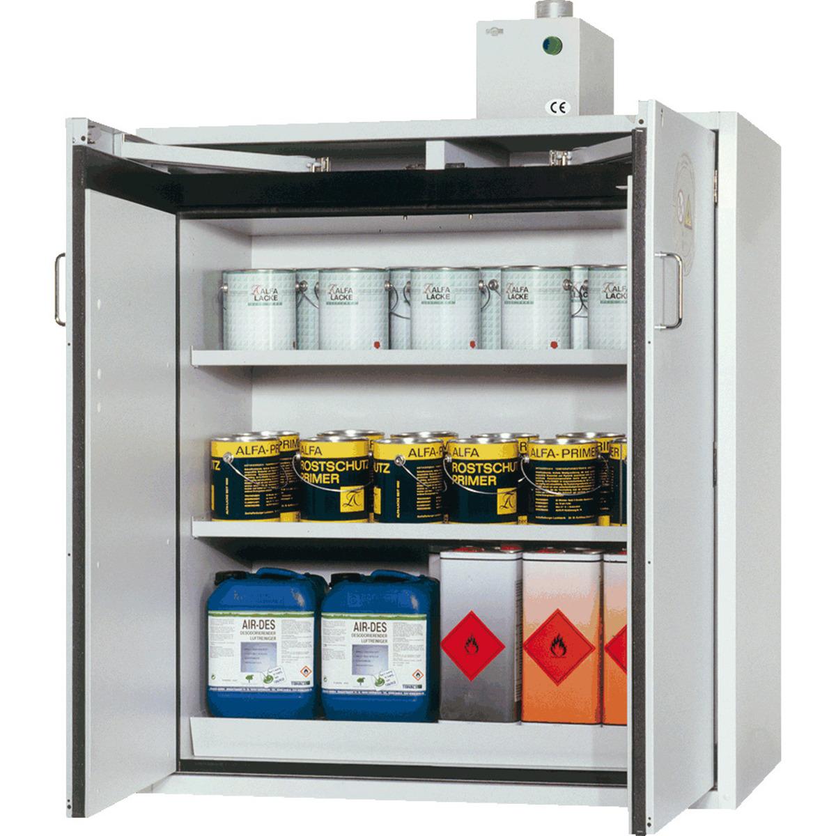 Kompakter asecos® Sicherheitsschrank Typ 90 mit Flügeltüren und Türfeststellanlage zur sicheren Lagerung entzündbarer Flüssigkeiten in Arbeitsräumen, mit Abluft- und Erdungsanschluss, Wannenböden und Bodenauffangwanne