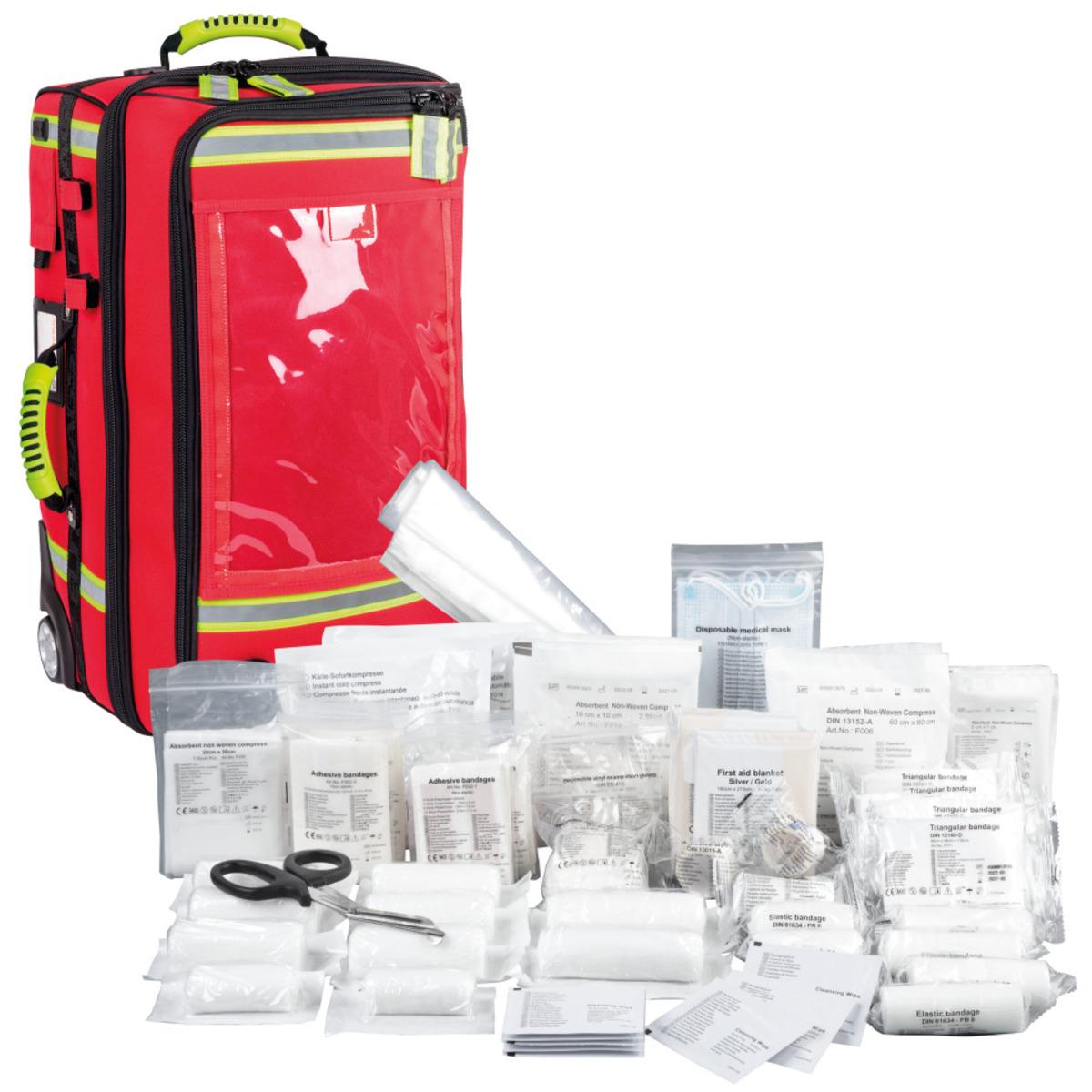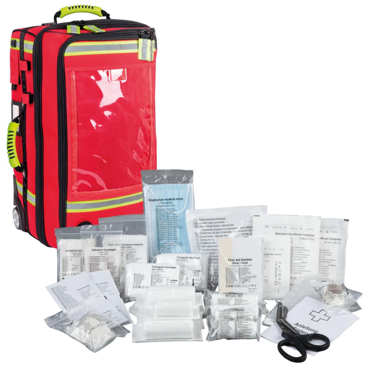 Großer Notfallkoffer mit Füllung und integrierter Sauerstoffversorgung, Trolley-System für den komfortablen Transport, verstaubares Rucksacktragesystem, vier herausnehmbare Reißverschluss(RV)-Modultaschen mit Klarsichtfenster.