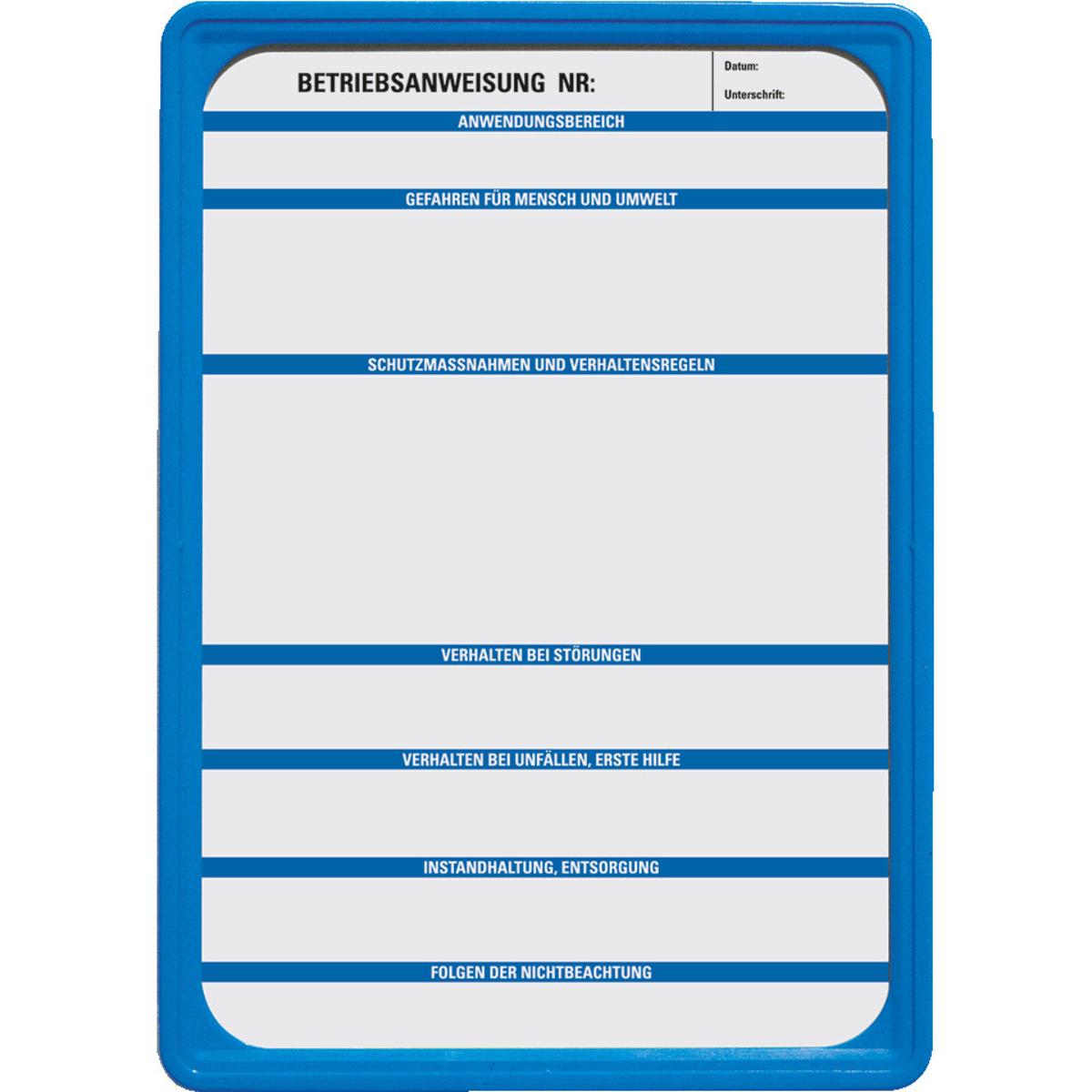Auswahl: Blanko-Betriebsaweisung im Rahmen, mit Befestigung, blau, Kunststoff, DIN A4