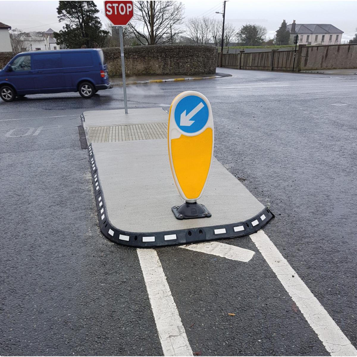 Mobiler Gummiboardstein zum Leiten des Verkehrs, für Kreisverkehr oder Verkehrsinseln geeignet, mit 3M Reflextape, biegbar und flexibel, kann auch als mobile Bordsteinrampe verwendet werden.