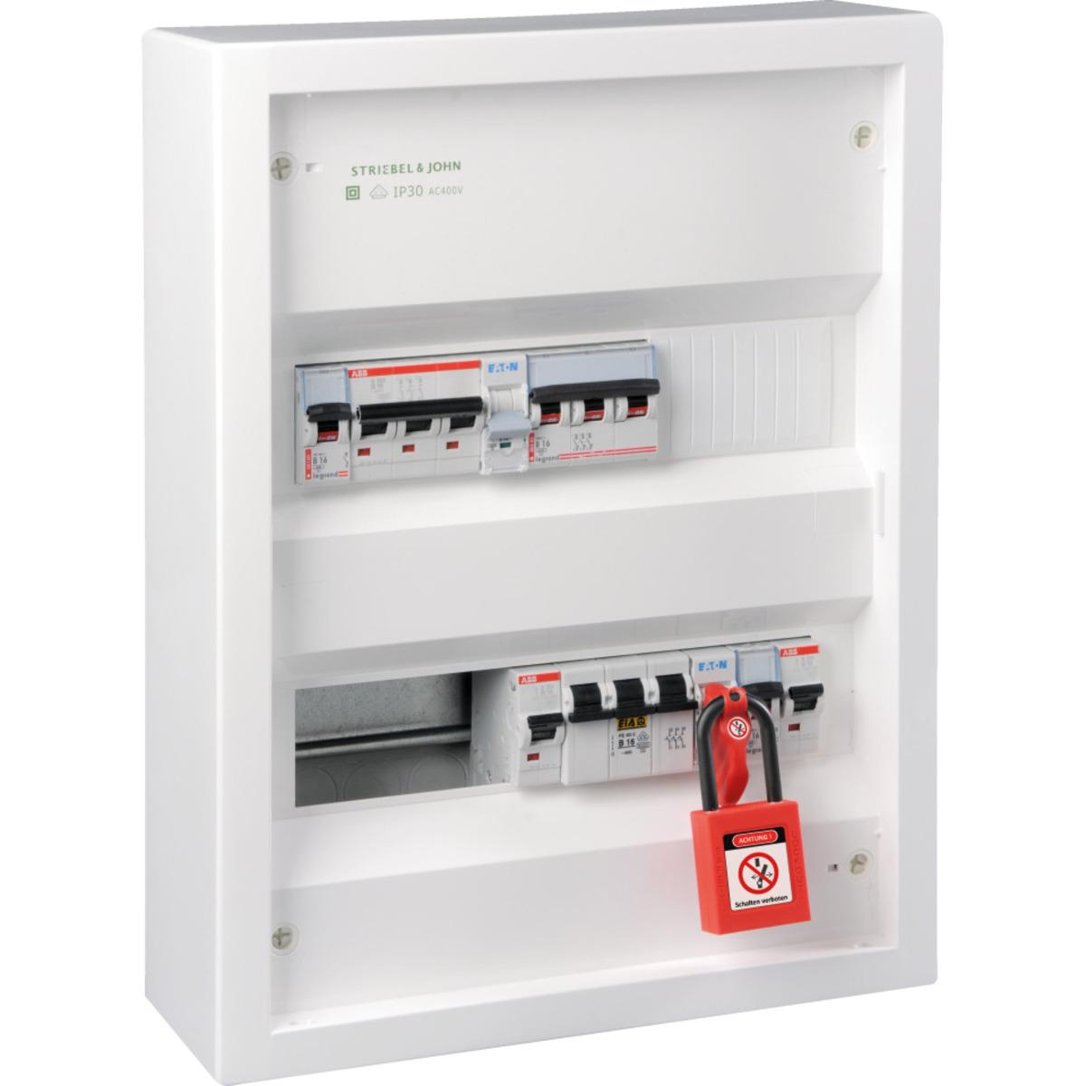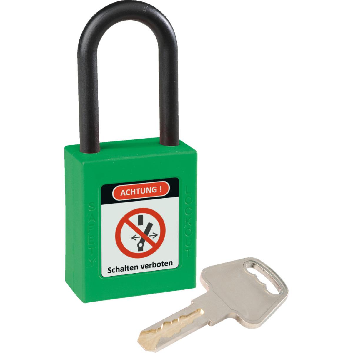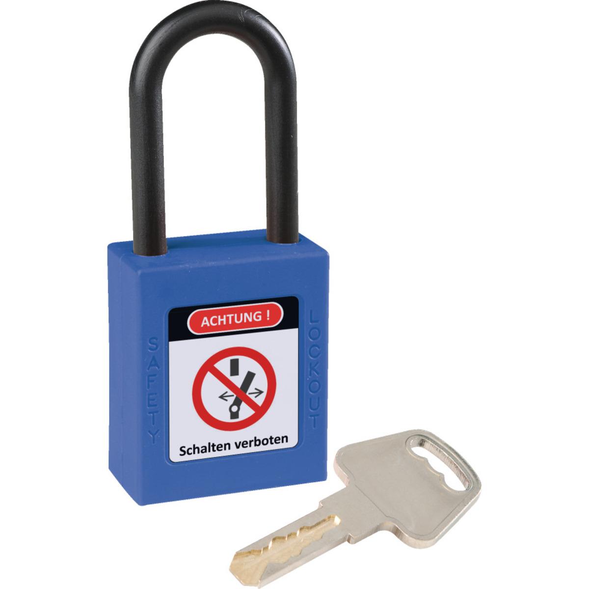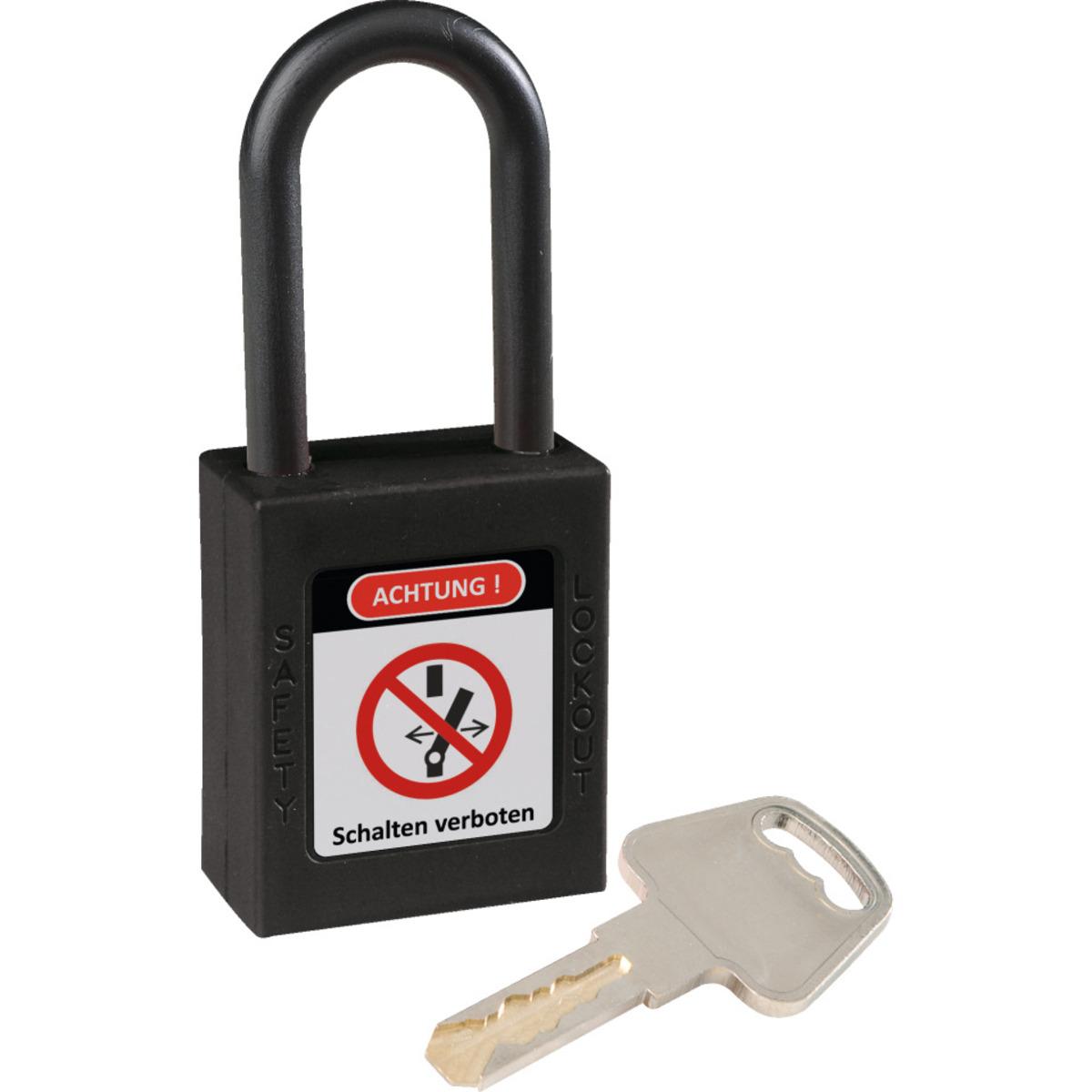Vorhängeschloss mit Kunststoffbügel zur Wartungssicherung, inklusive selbstklebender Etiketten mit leeren Feldern und Piktogrammen zur Identifizierung des Monteurs, mit Verbotszeichen "Schalten verboten", nicht leitendes Gehäuse und Bügel