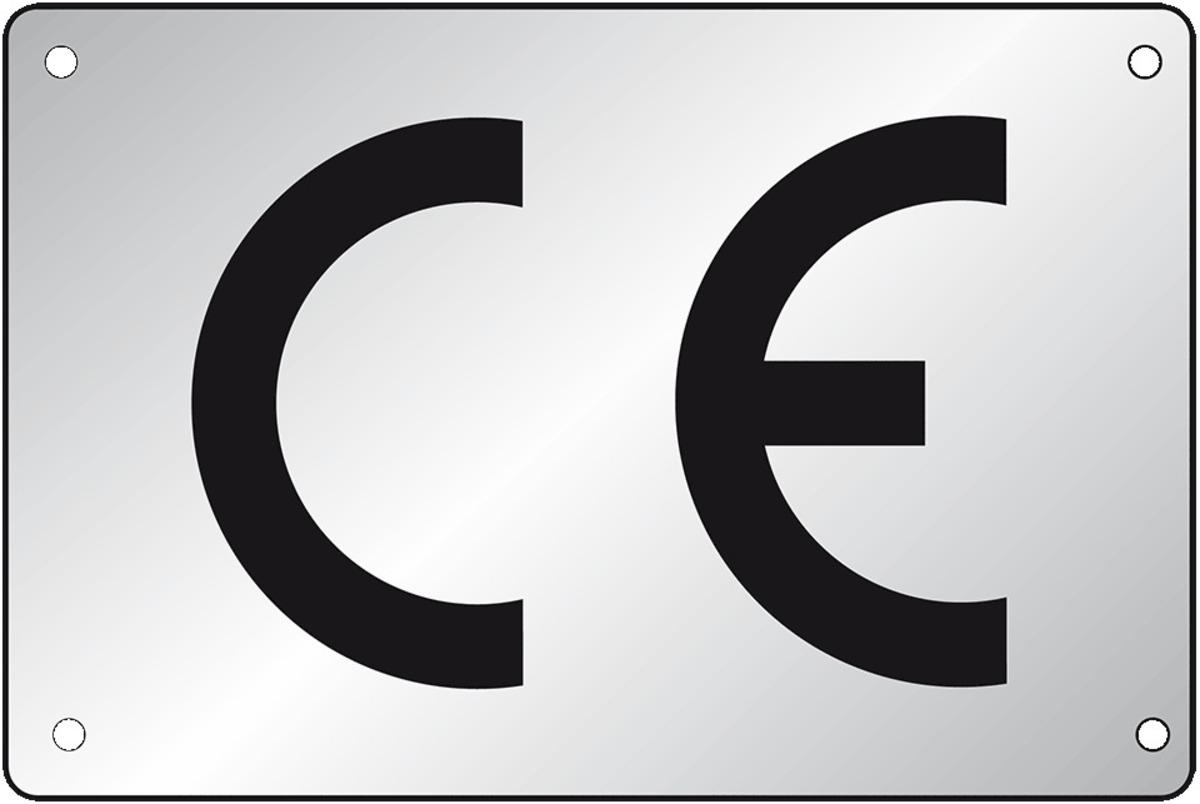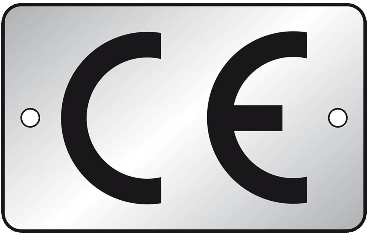 CE-Zeichen zur Konformitätskennzeichnung von Maschinen und Geräten. Das CE-Zeichen kann aufgeklebt, -geschraubt oder -genietet werden.