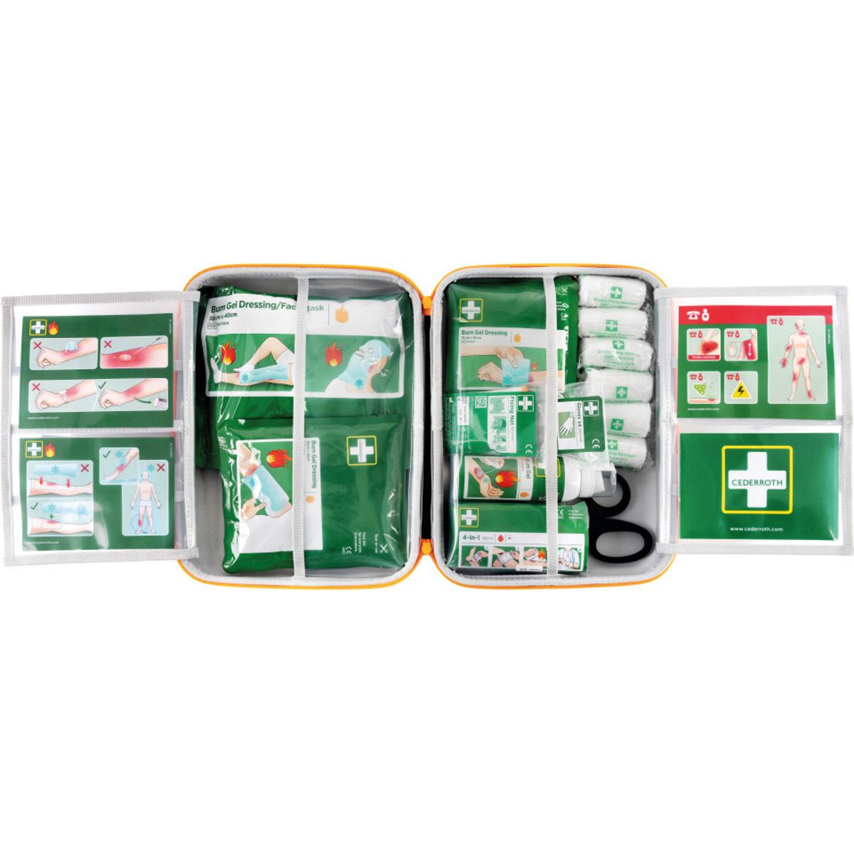 Umfangreiches CEDERROTH Erste Hilfe Kit mit zusätzlichen Kompressen für Brandwunden in verschiedenen Größen sowie einer großen Kompresse/Gesichtsmaske, kühlende und schmerzlindernde Wirkung bei Brandwunden und Sonnenbrand, ideal für Arbeitsplätze mit hoher Verbrennungsgefahr durch offenes Feuer, Flammen, heiße Oberflächen, Dampf, heiße Flüssigkeiten und Öfen