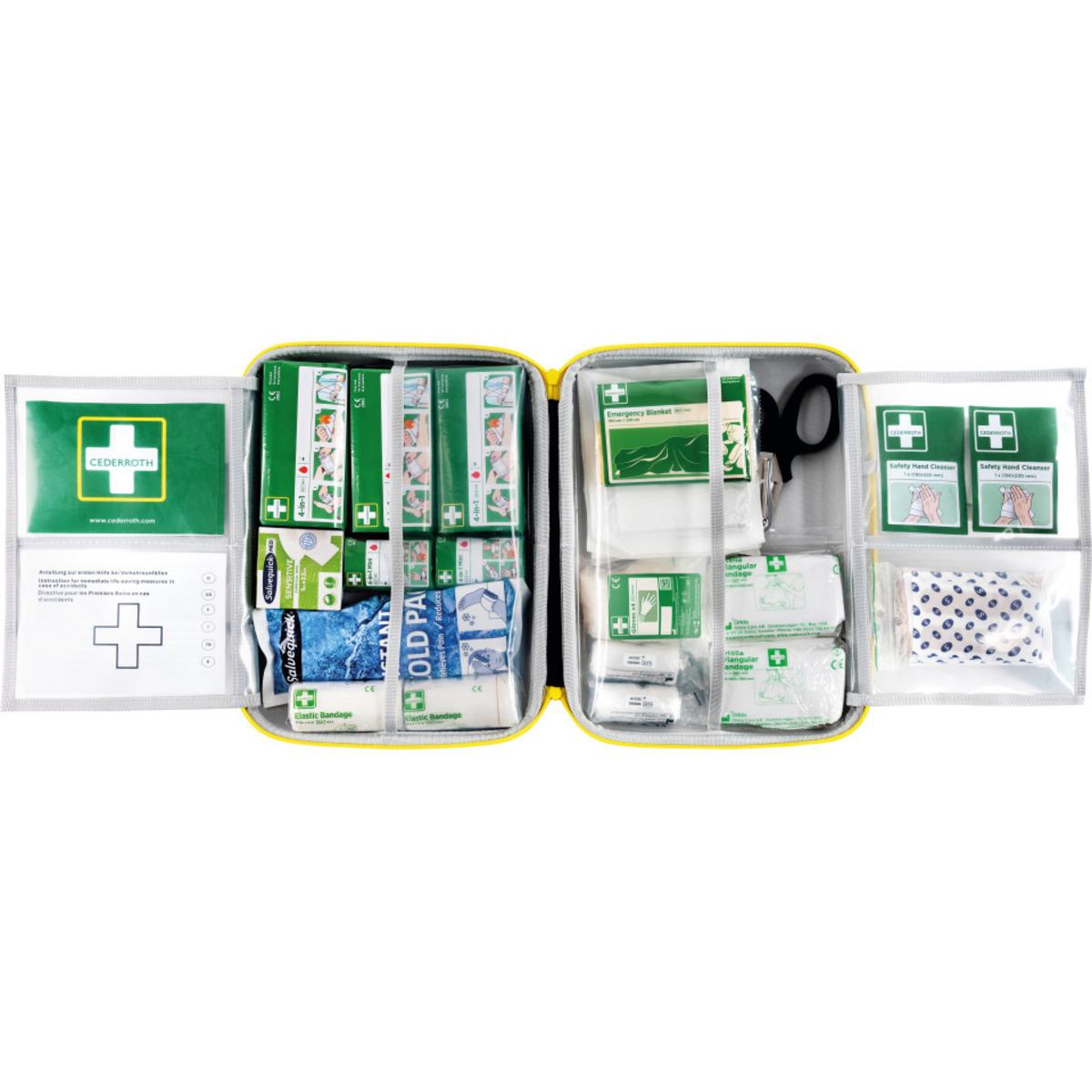 Cederroth Erste Hilfe Kit Large mit Füllung nach aktueller Norm. Praktische und stabile Tasche zum Schutz vor Staub und Feuchtigkeit, mit Griff und umlaufendem Reißverschluss.