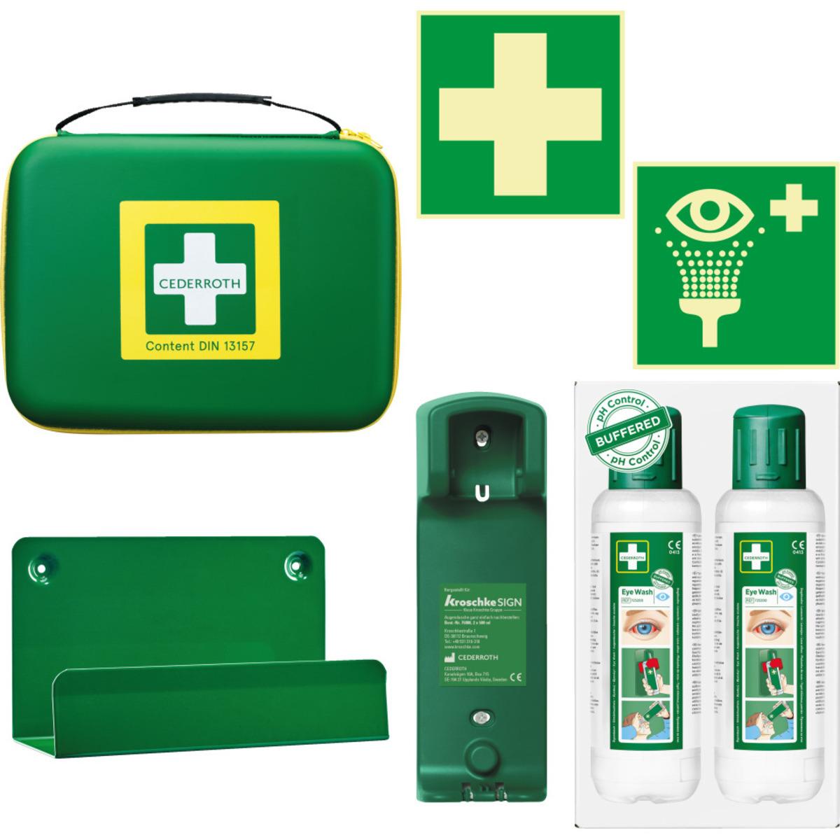 Vorteils-Set mit großem CEDERROTH Erste-Hilfe-Kit Large mit Wandhalterung und Füllung nach aktueller Norm zur Erstversorgung, CEDERROTH Augendusche und Wandhalterung sowie entsprechenden Rettungszeichen.