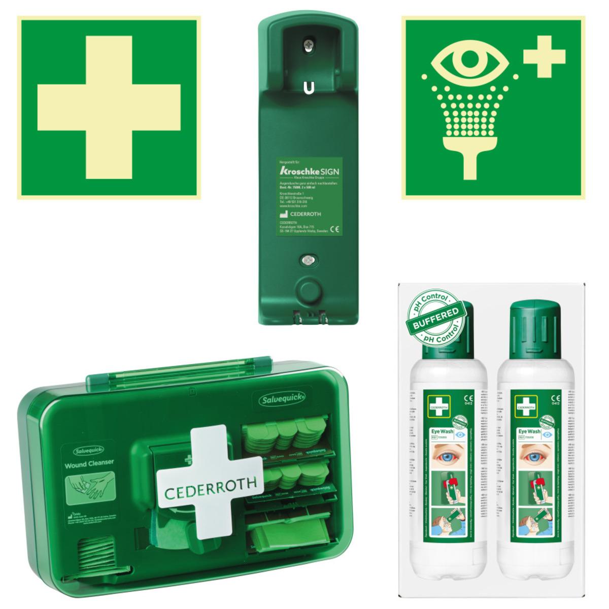Praktisches Vorteils-Set, das den CEDERROTH Pflasterspender PLUS und die CEDERROTH Augendusche mit Wandhalterung und entsprechenden Rettungszeichen kombiniert.
