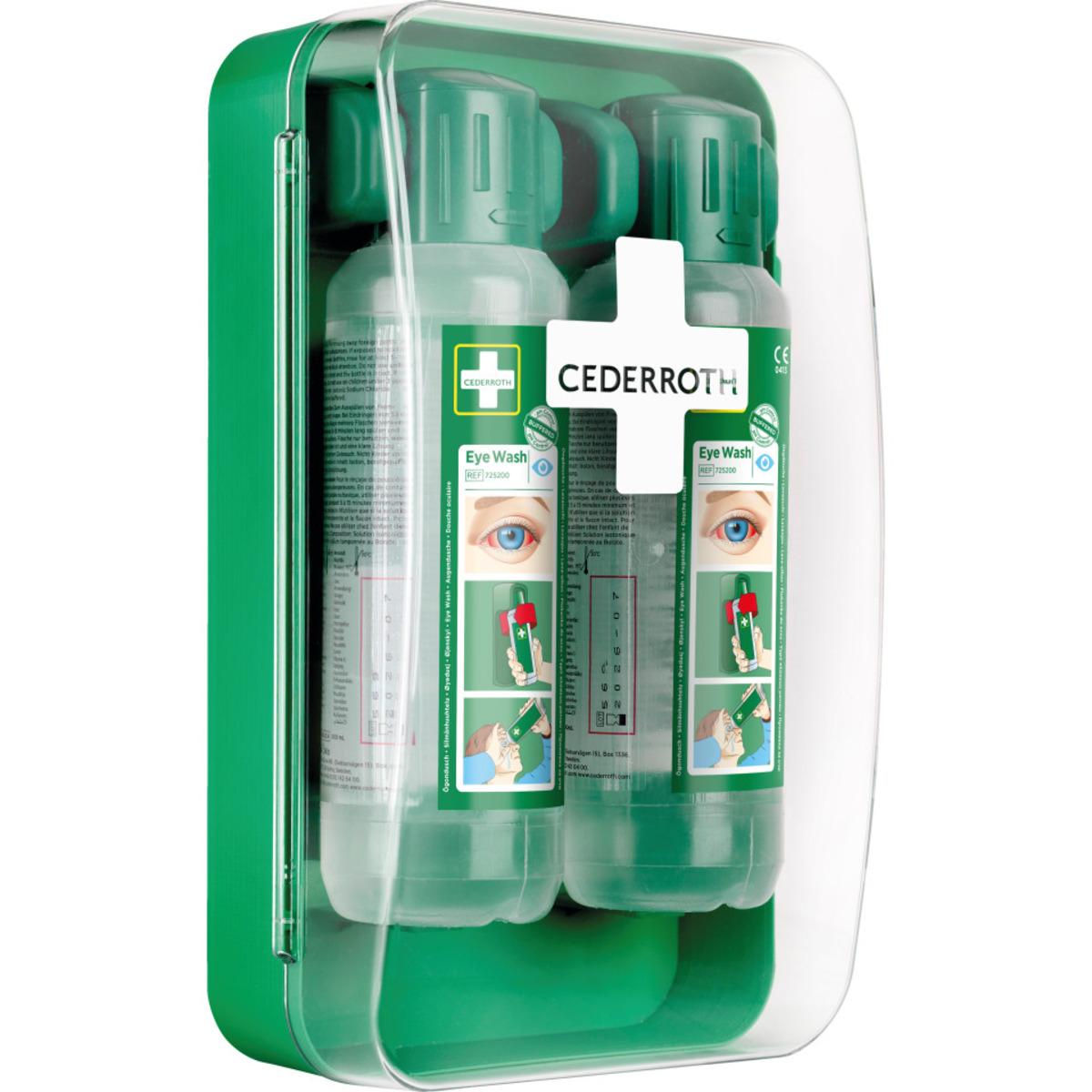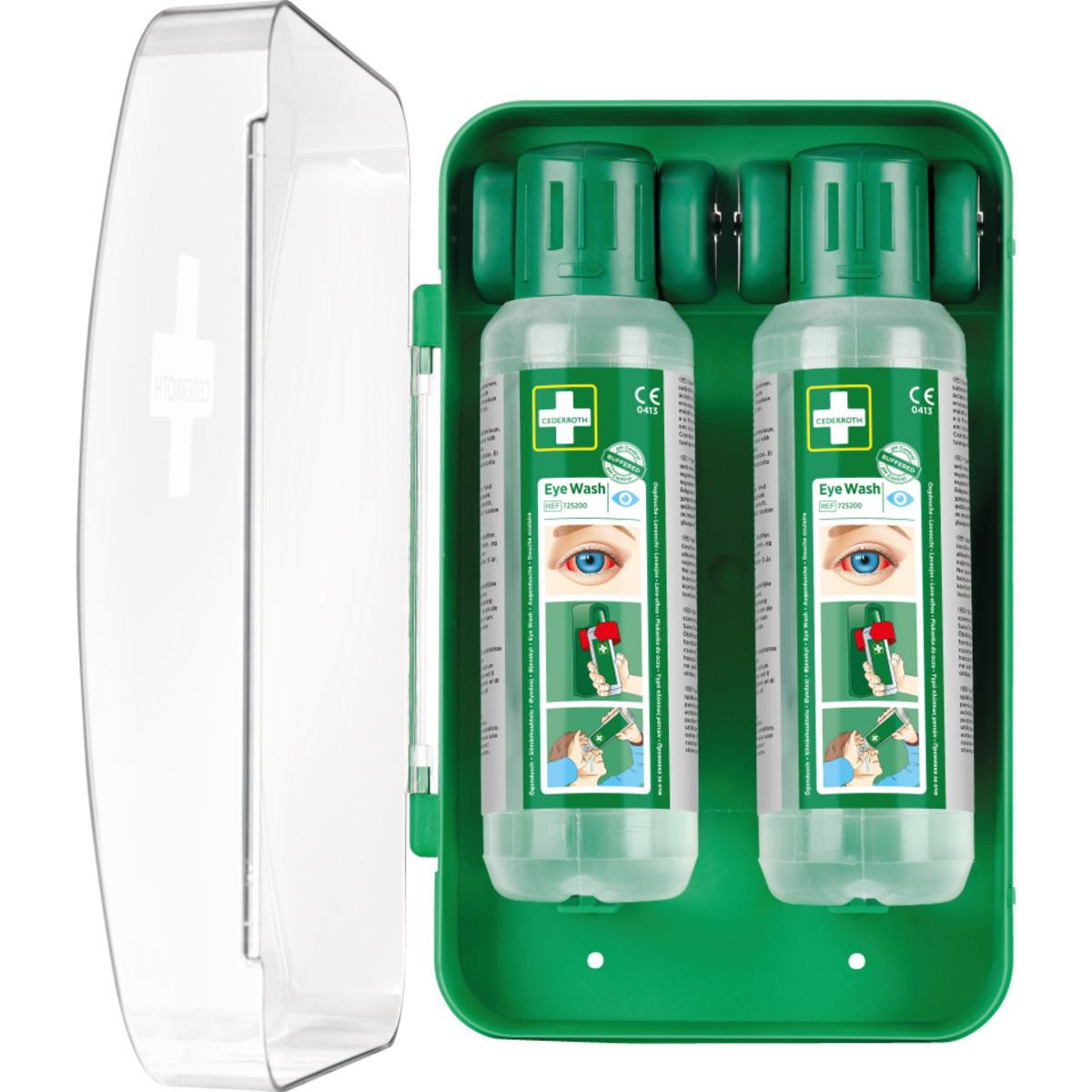 Vorteilsset mit 2 Flaschen CEDEROTH Augenduschen und praktischer Wandhalterung, transparente Abdeckung für gute Sichtbarkeit, beim Herausdrehen aus der Halterung öffnen sich die Flaschen automatisch, so kann sofort mit der Spülung begonnen werden.