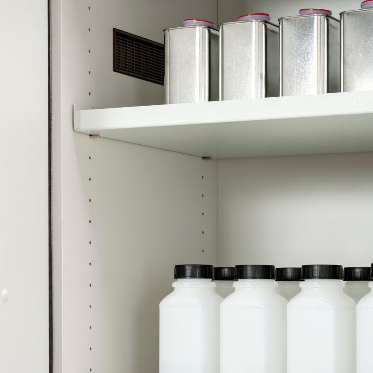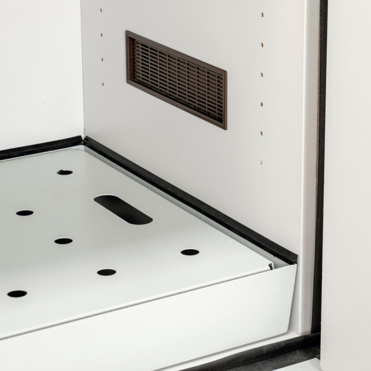Der Brandschutzschrank bietet 90 Minuten Feuerwiderstand für Gebinde bis 30 Liter. Mit 2-Punkt-Verriegelung, selbstschließenden Türen, höhenverstellbarem Wannenboden, Lüftungsanschluss, unterfahrbar, Erdungsanschluss und optionaler Kabeldurchführung
