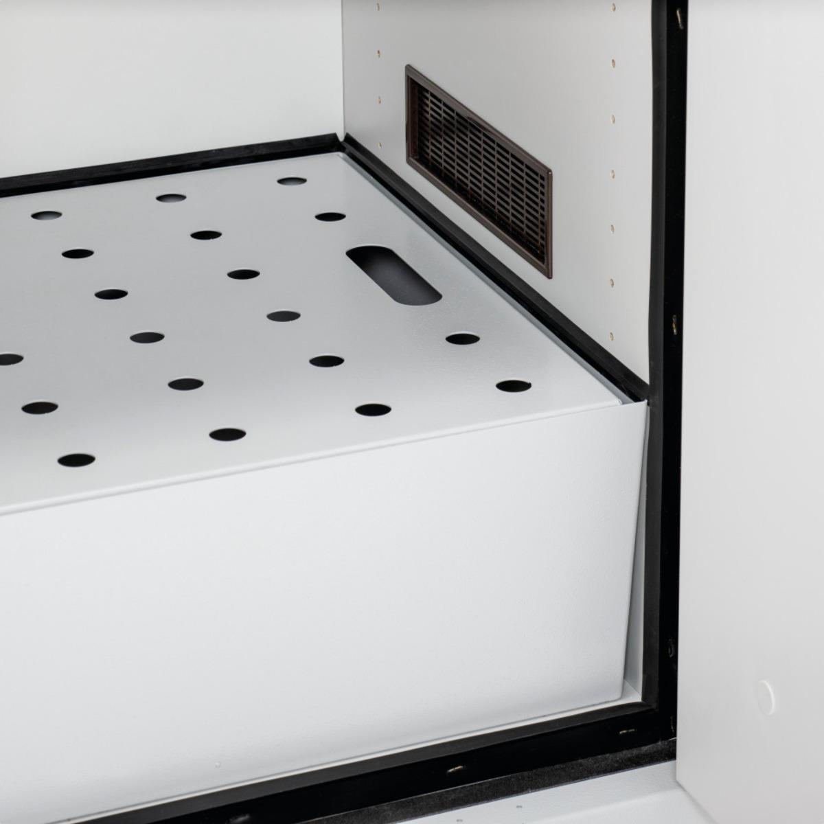 Der Brandschutzschrank bietet 90 Minuten Feuerwiderstand für Gebinde bis 30/60 Liter. Mit 2-Punkt-Verriegelung, selbstschließenden Türen, höhenverstellbarem Wannenboden (75 kg), unterfahrbar, Erdungsanschluss, optionaler Kabeldurchführung und abnehmbarer Sockelblende