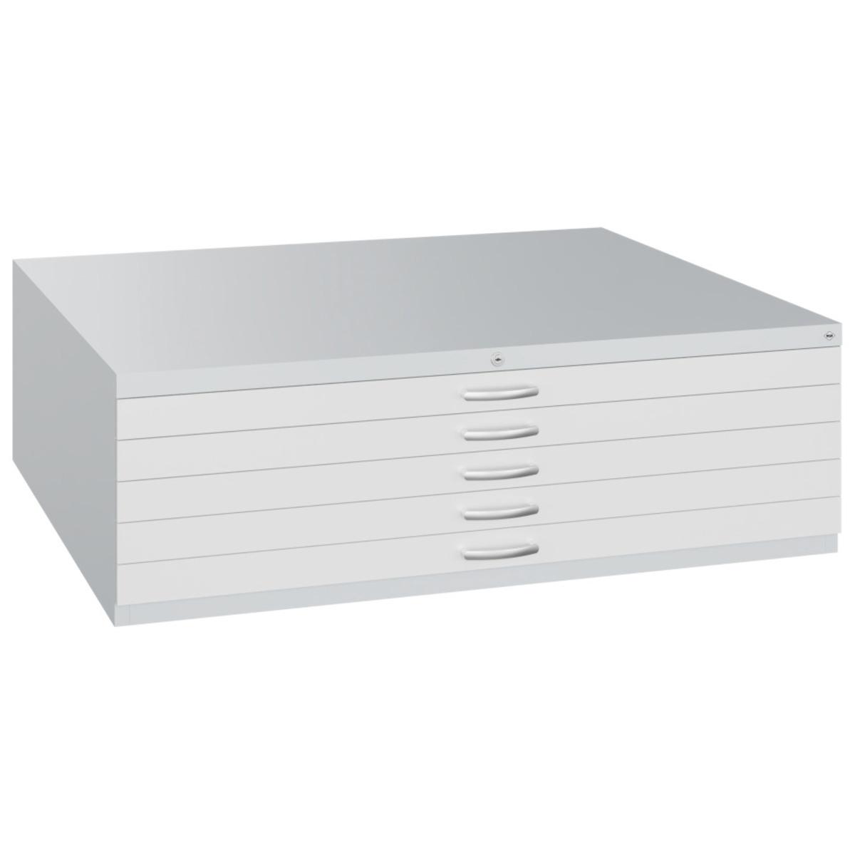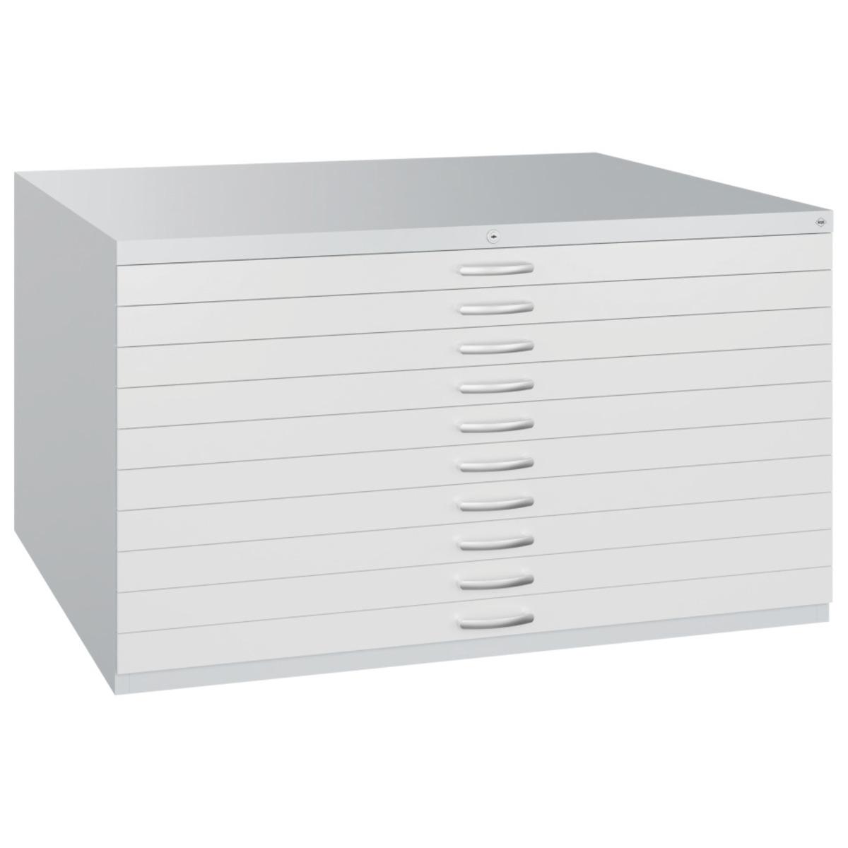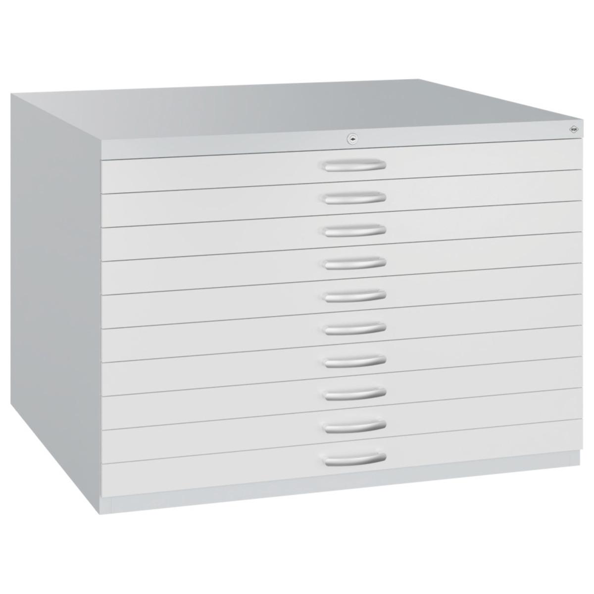 Stabiler Schubladenschrank mit 5 bzw. 10 Schubladen auf langlebigen 2-fach Teleskopschienen mit hoher Traglast von 40 kg, inkl. Auszugssperre, gerastert und unterteilbar für Formate bis DIN A1, UV-beständig
