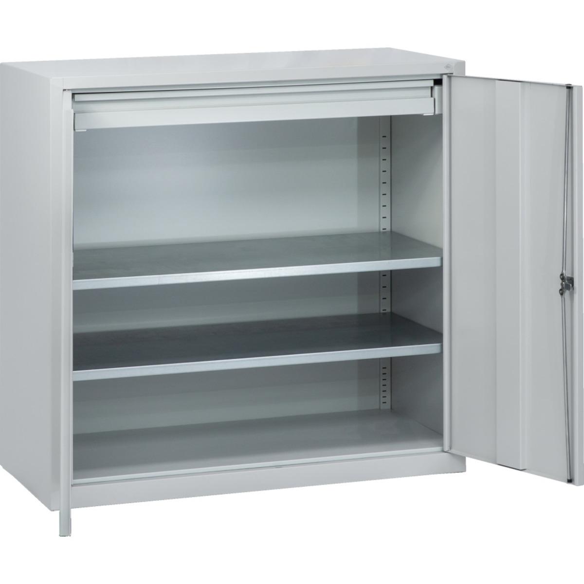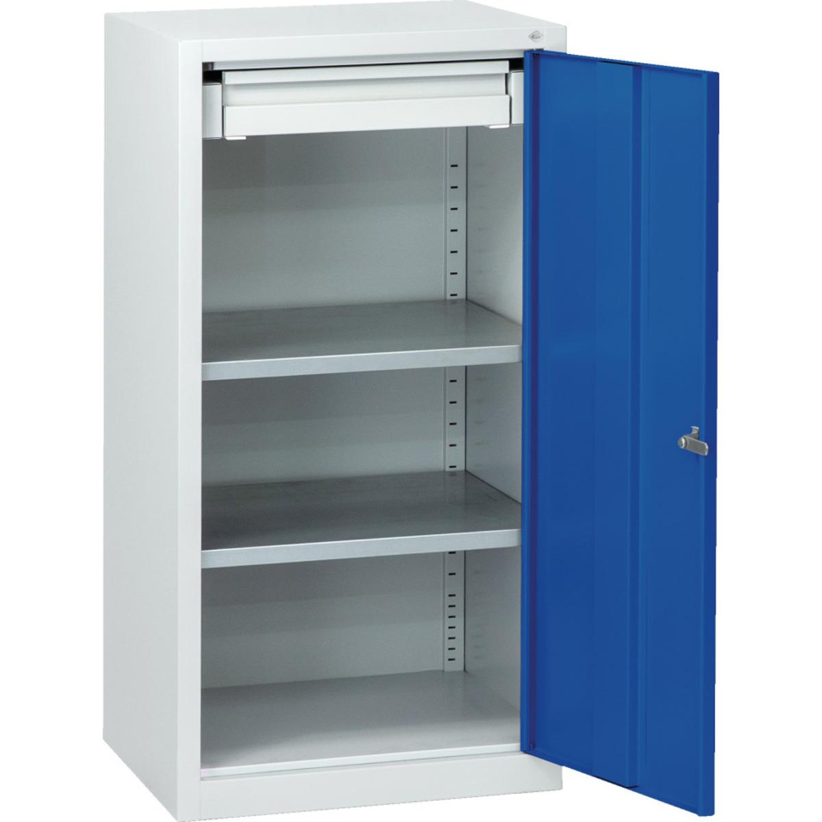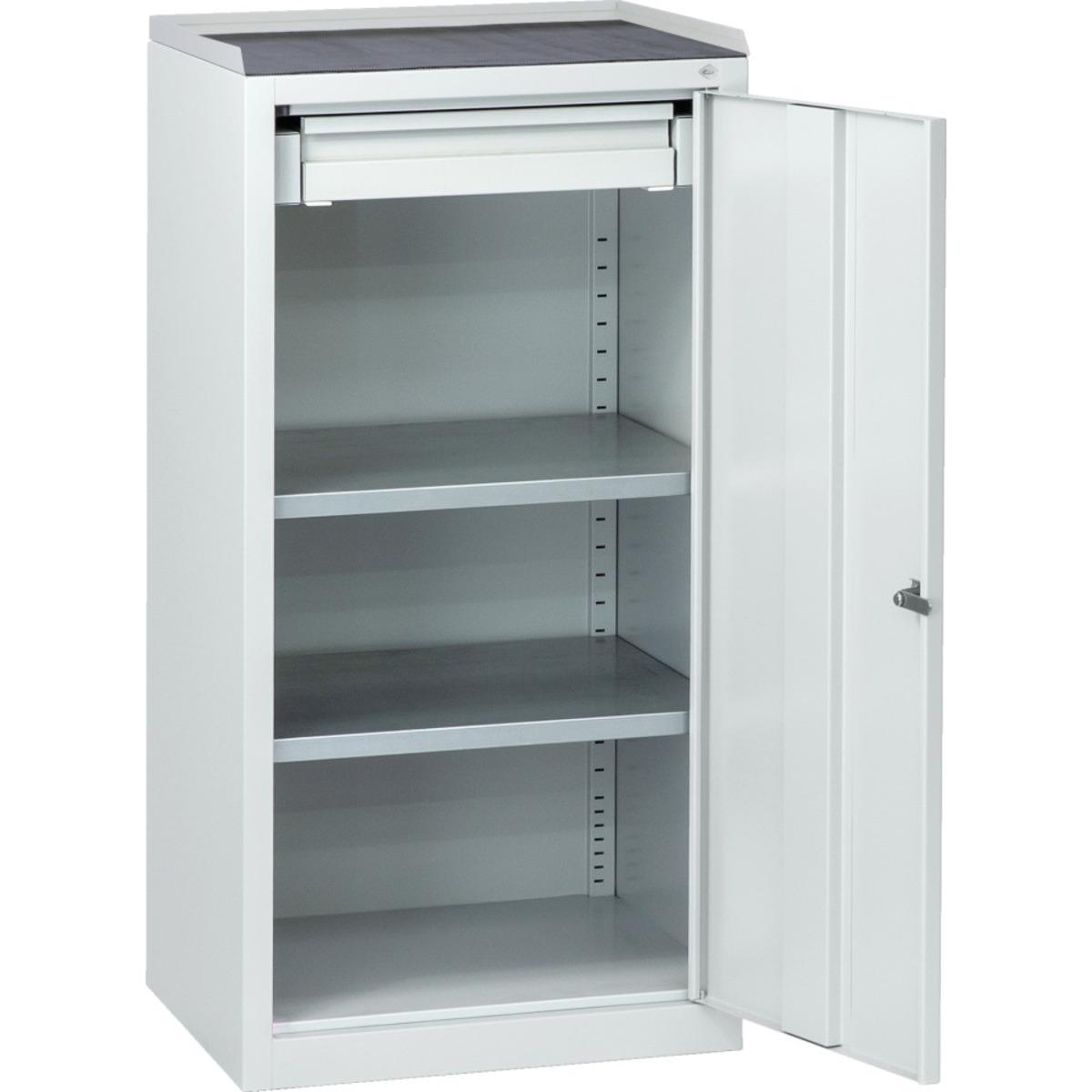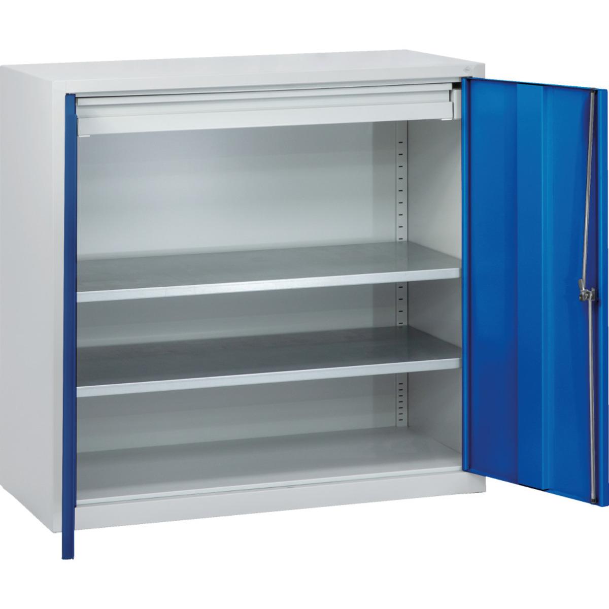 Flügeltürenschrank Serie 89 mit hoher Flexibilität der Inneneinrichtung durch Höhenverstellbarkeit im 30 mm Raster, verstärkte Tür für hohe Stabilität, Türaufhängung in Drehbolzen mit Öffnungswinkel ca. 110 Grad, rechts angeschlagen, 2 Einlegeböden aus Stahl verzinkt, mit hoher Traglast von 50 kg