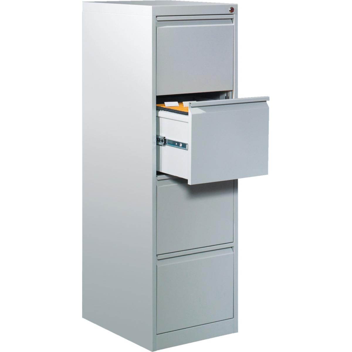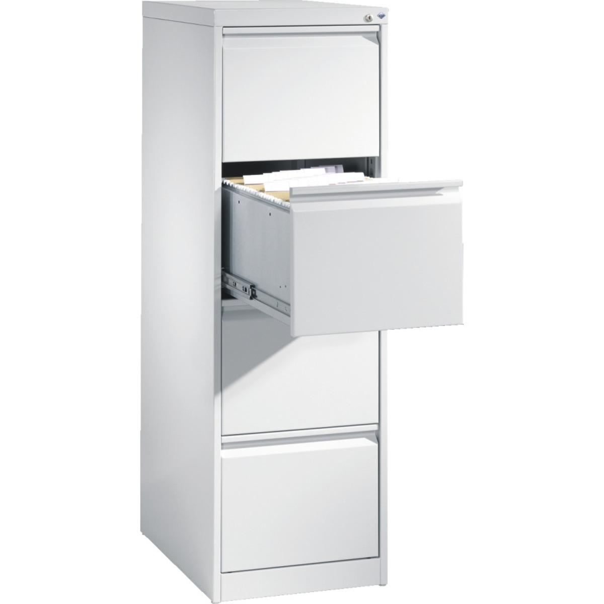 Hängeregistraturschrank mit 4 voll ausziehbaren Schubladen auf langlebigen 2-fach Teleskopschienen mit hoher Traglast von 50 kg je Schub, mit integrierter durchgehender Griffleiste, für DIN A4-Hängehefter, inkl. Auszugsperre, Zentralverschluss