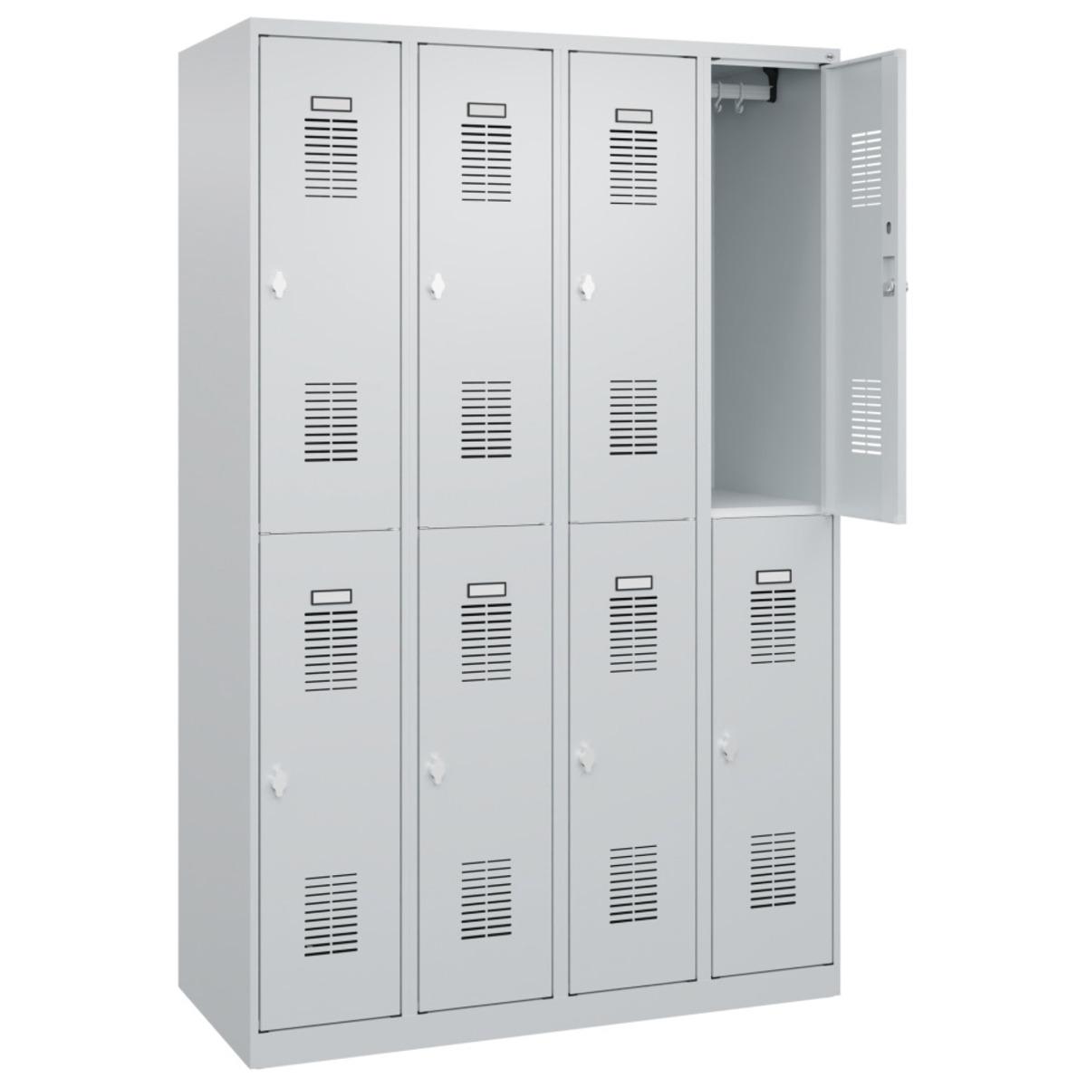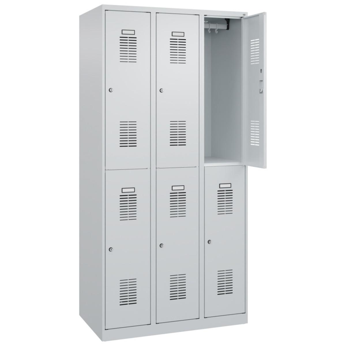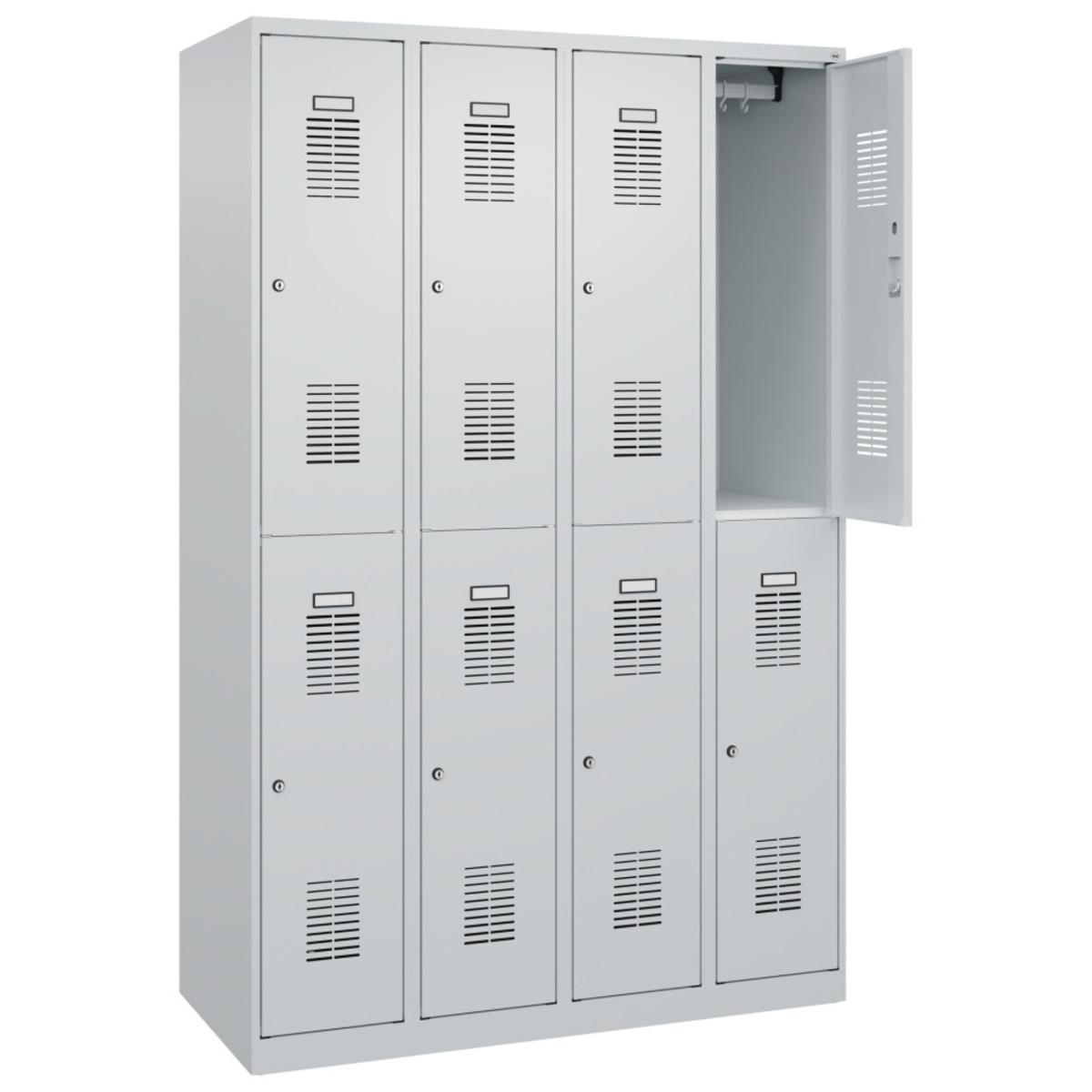C+P Spind Basis PLUS, doppelstöckig mit Abteilbreite 300 mm, Einbrennbeschichtung für hohe UV- und Korrosionsbeständigkeit, je Fach 1 stabile Garderobenstange aus Ovalprofil mit 2 verdrehsicheren Schiebehaken, mit Kunststoffgleitern, Türen mit Soft-Anschlag und geschlossenen Seitenprofilen für hohe Stabilität, Lüftungsschlitze oben und unten, Aufhängung in stabilen Drehbolzen, Schließkreis bis 1000 verschiedene Schließungen, Kunststoff-Etikettenrahmen.