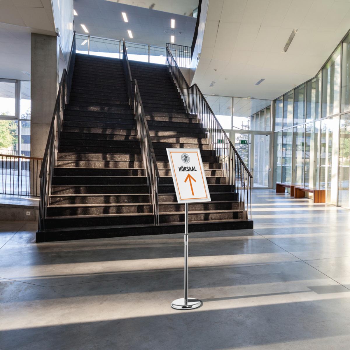 Der DURABLE Bodenständer für Infotafeln im DIN A3 Format ist höhenverstellbar und lässt sich problemlos durch ein Kugelgelenk vom Hoch- ins Querformat drehen. Der runde Standfuß mit Gummiring verhindert Kratzer auf dem Boden.