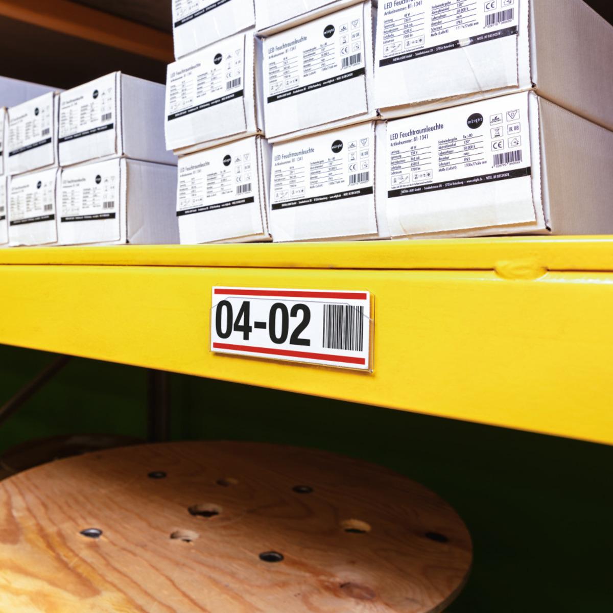 Scannertaugliche Etikettentaschen mit zwei rückseitigen Permanent-Klebestreifen zur Befestigung an metallischen Oberflächen, Kunststoffbehältern, Holz und Kartonagen.