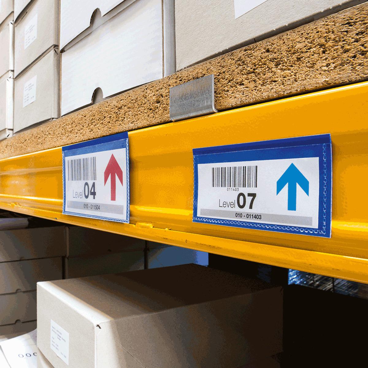 Scannertaugliche Etikettentasche mit zwei rückseitigen Magnetstreifen zur Befestigung an metallischen Oberflächen wie z.B. Lagerregale, Lochblechwände, Metallbehälter und CAN-BAN Behälter.