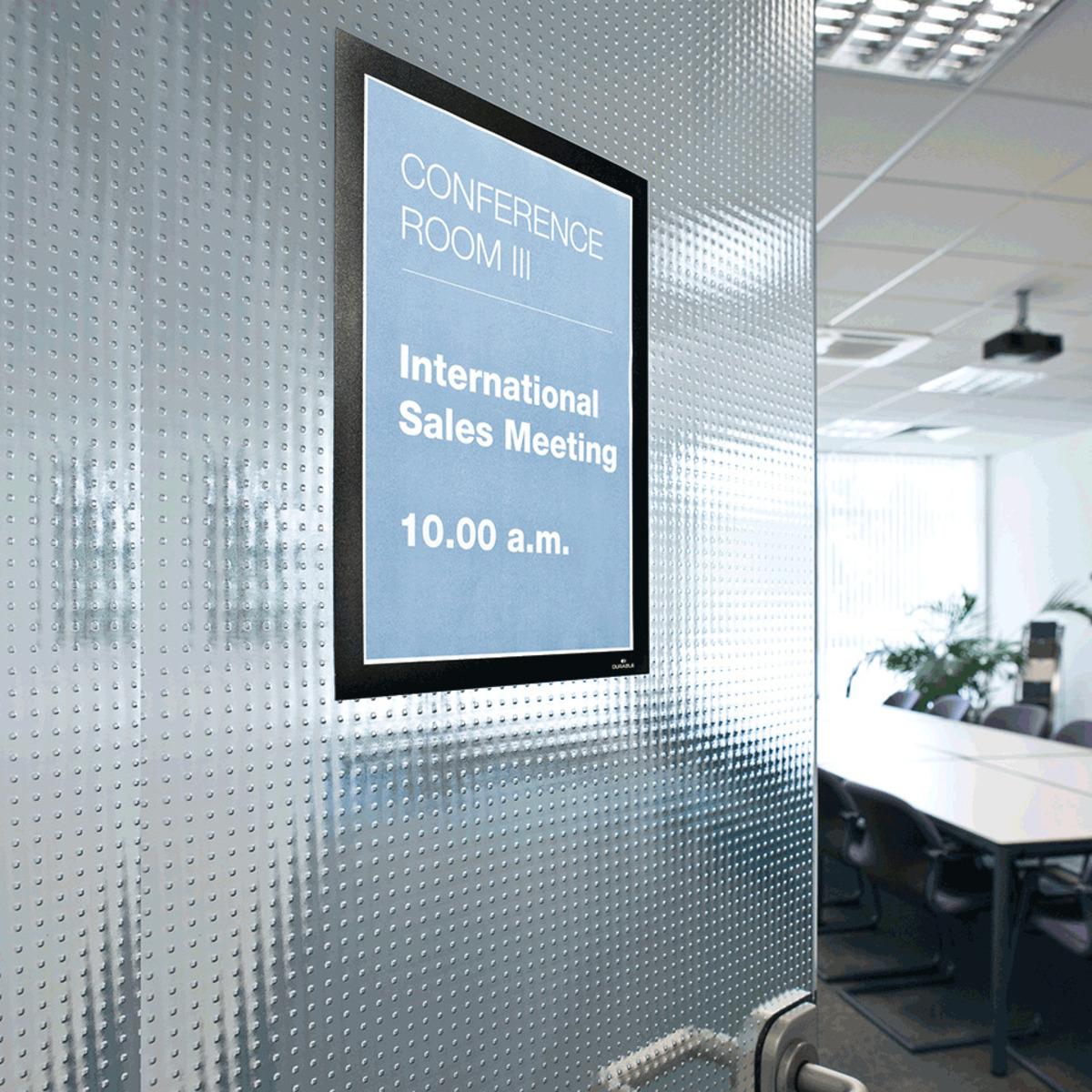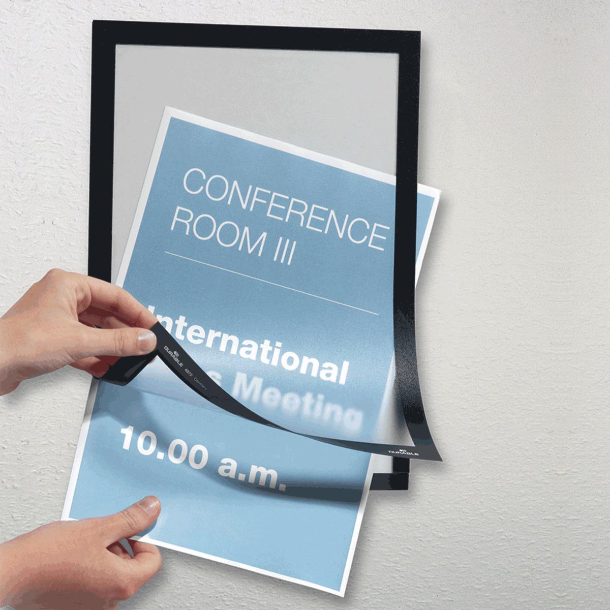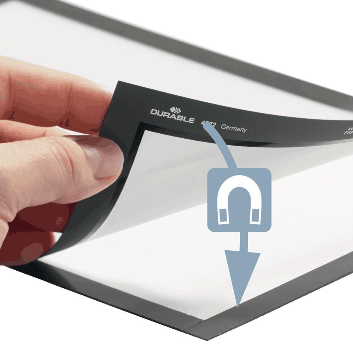 DURABLE Informationsrahmen DURAFRAME, zur Befestigung von Betriebsanweisungen. Durch die selbstklebende Rückseite haftet der Rahmen auf allen glatten Oberflächen. Aushänge können durch magnetische Vorderseite beliebig oft ausgetauscht werden, Quer- und Hochformat möglich