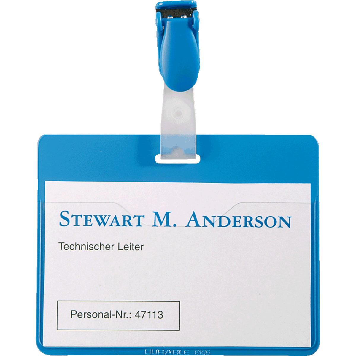 DURABLE-Namensschild mit Clip, nach oben offene Tasche, zum schnellen Entnehmen des Ausweises ohne Entfernen des Clips. Ausstanzung ermöglicht Kombination mit DURABEL Kette, Jojo oder Textilband
