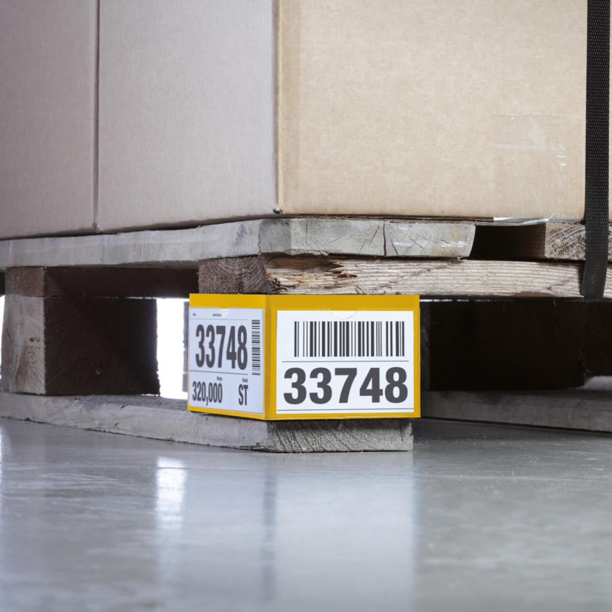 Diese Palettenfußbanderole zur Kennzeichnung von Palettenfüßen ermöglicht eine 4-seitige Beschriftung und ist mit einer Daumenstanzung zum Einschieben der Einsteckschilder versehen. Durch integrierten Klettverschluss lässt sich die Banderole am äußeren Palettenfuß befestigen.